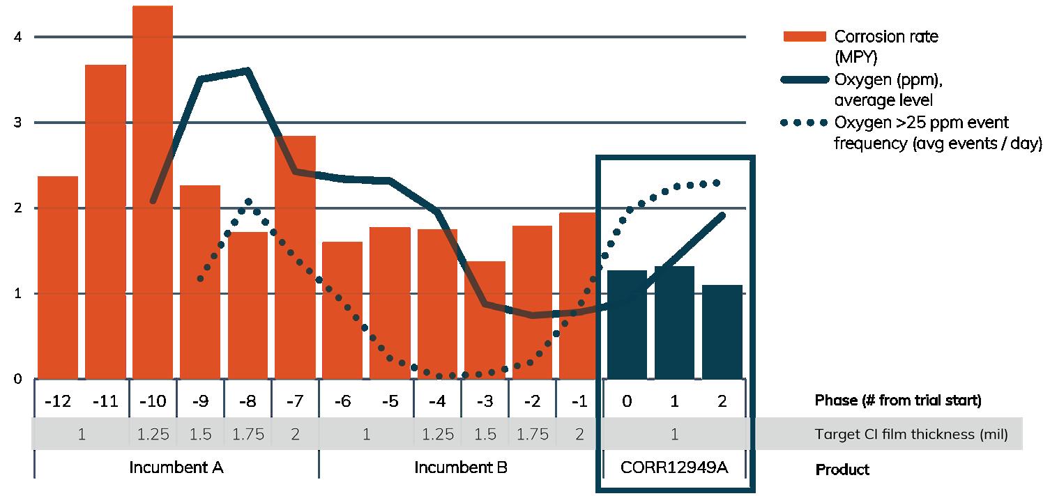Figure 1. Even with elevated oxygen levels, CORR12949A reduced the corrosion rate month-overmonth in a recent field trial.