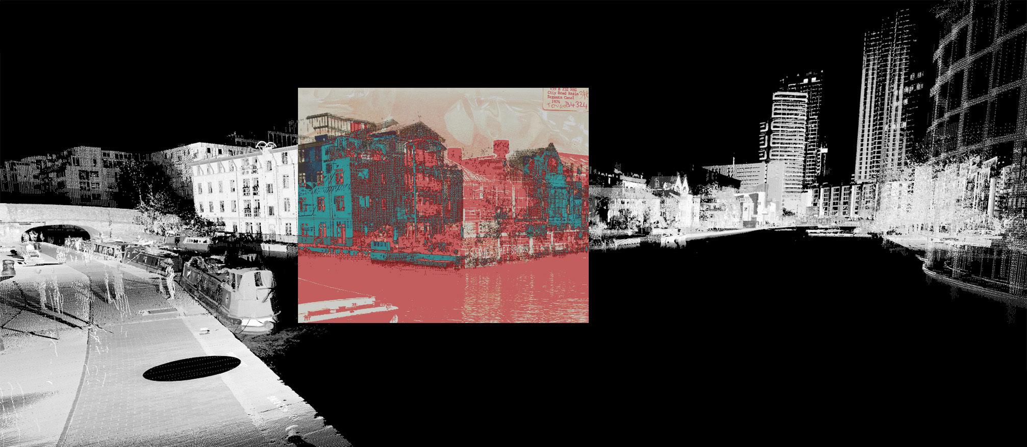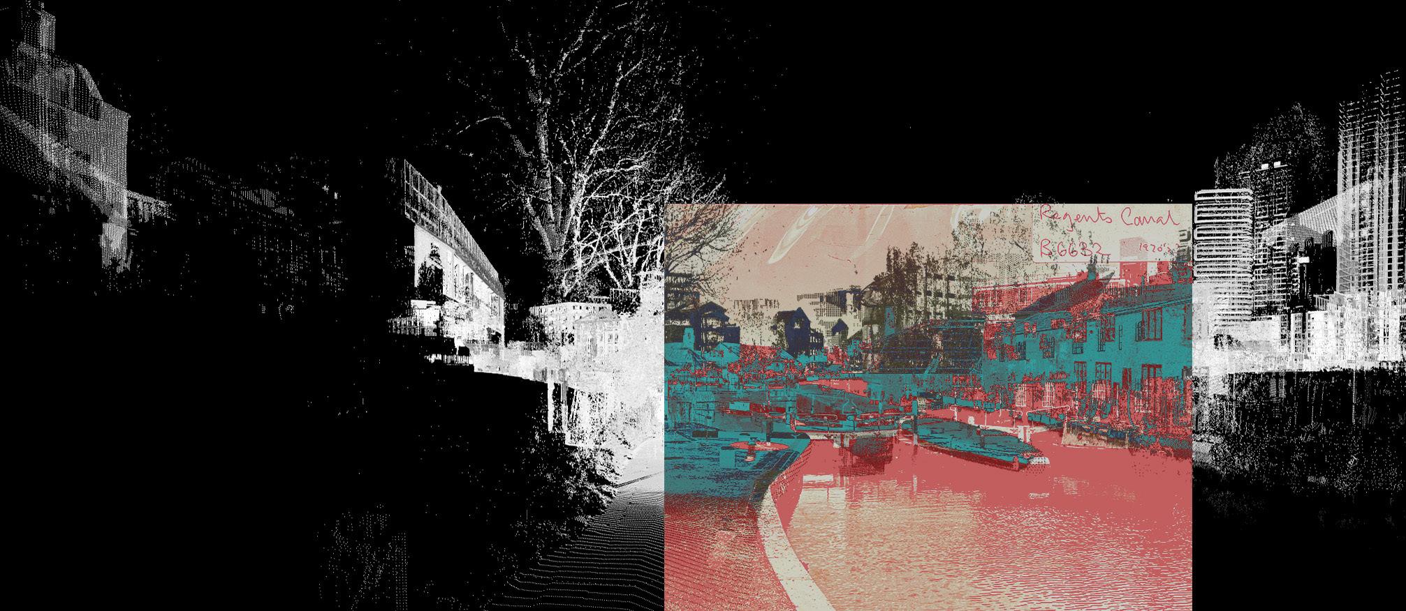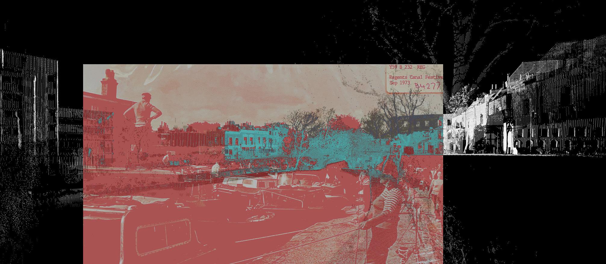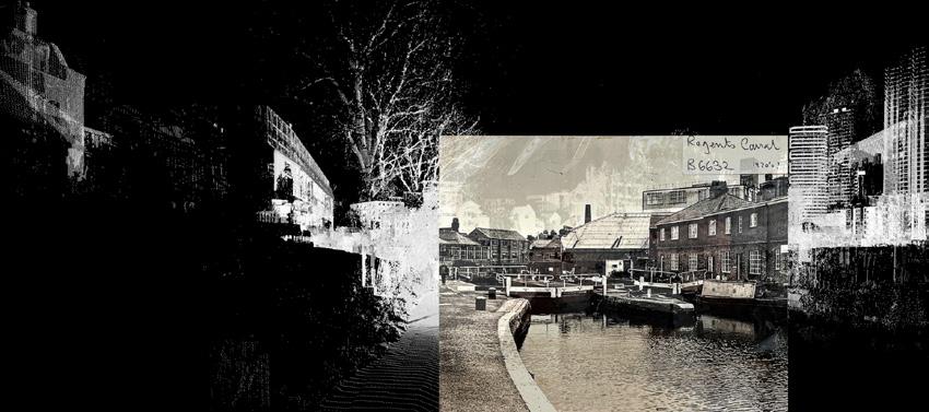 historical images. On top of these digital snapshots, the images, which are dated between 1920 and 1980, are superimposed. In Photoshop, a difference is then created between the current and the historical stock. To clarify this, it was coloured in the further process. A total of 17 collages were made which contain information about the historical development of the area. To illustrate this visually, a video was created that shows the historical layers of the Regent‘s Canal and the City Basin.