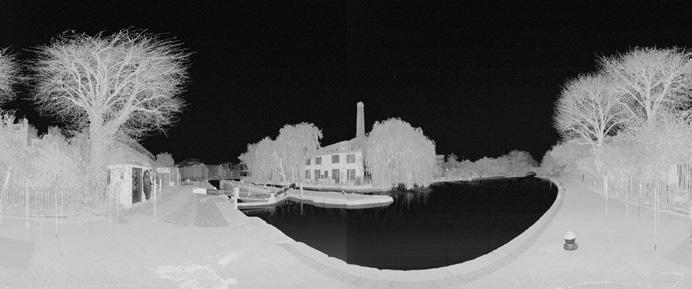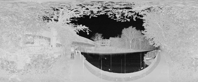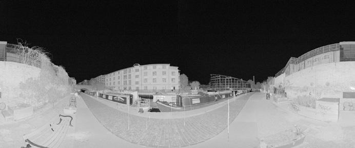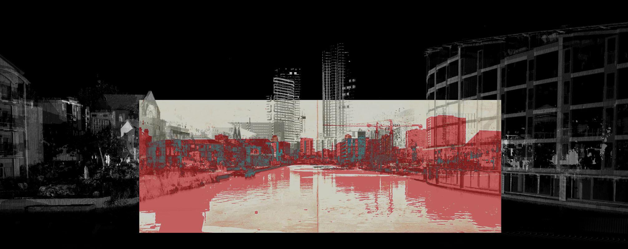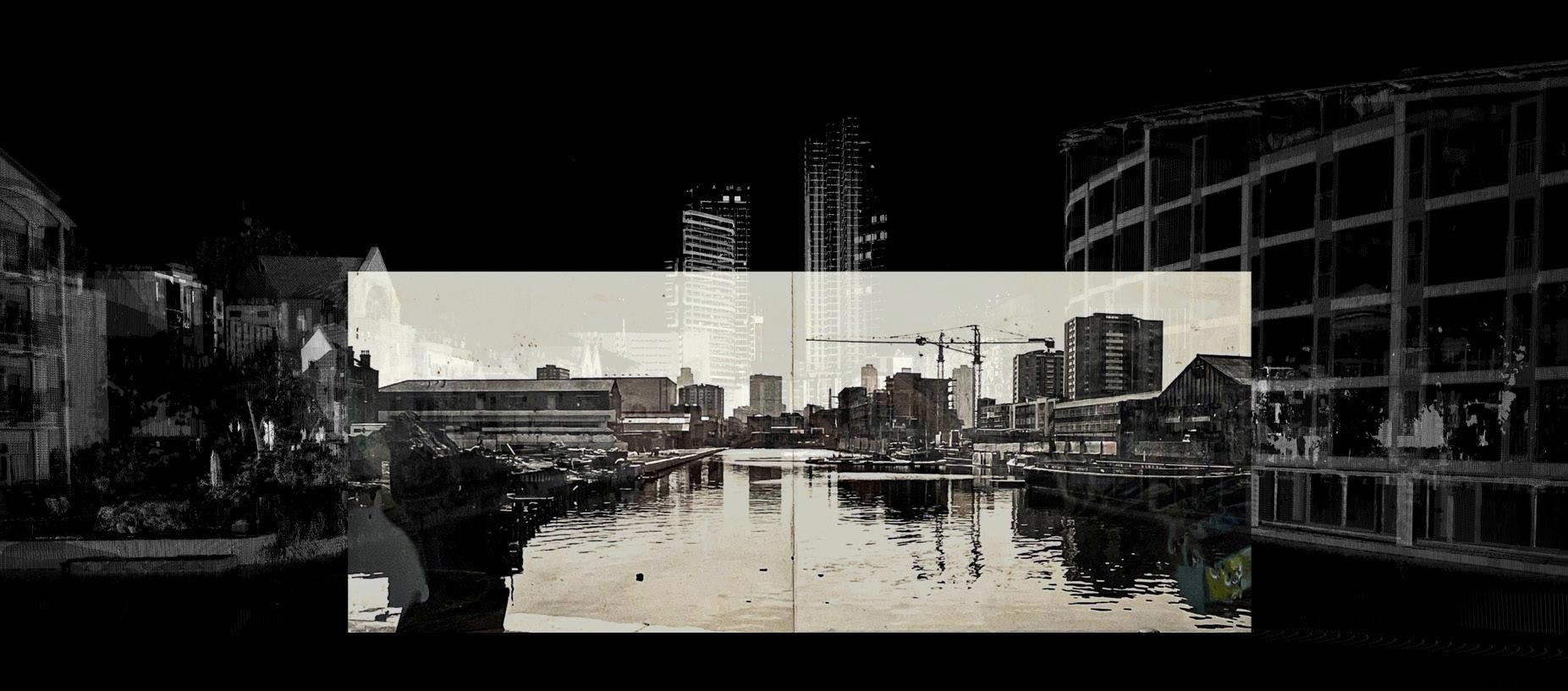 historical images. On top of these digital snapshots, the images, which are dated between 1920 and 1980, are superimposed. In Photoshop, a difference is then created between the current and the historical stock. To clarify this, it was coloured in the further process. A total of 17 collages were made which contain information about the historical development of the area. To illustrate this visually, a video was created that shows the historical layers of the Regent‘s Canal and the City Basin.
