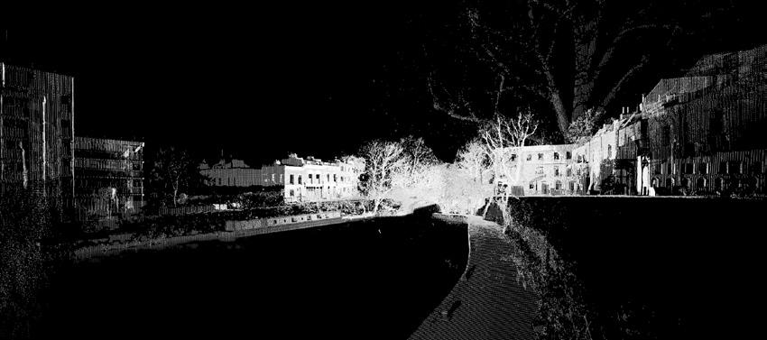 The faro Lidar Focus S350 scanner was used to survey the area. The focus of the data acquisition was the northern part of the area, especially the section of Vincent Terrace between the Islington Tunnel and Frog Lane Bridge and the area around the locks that regulate the water level of the canal. The survey was carried out in a circular clockwise direction around the area. A total of 17 scans were carried out. The instrument was set up as follows: