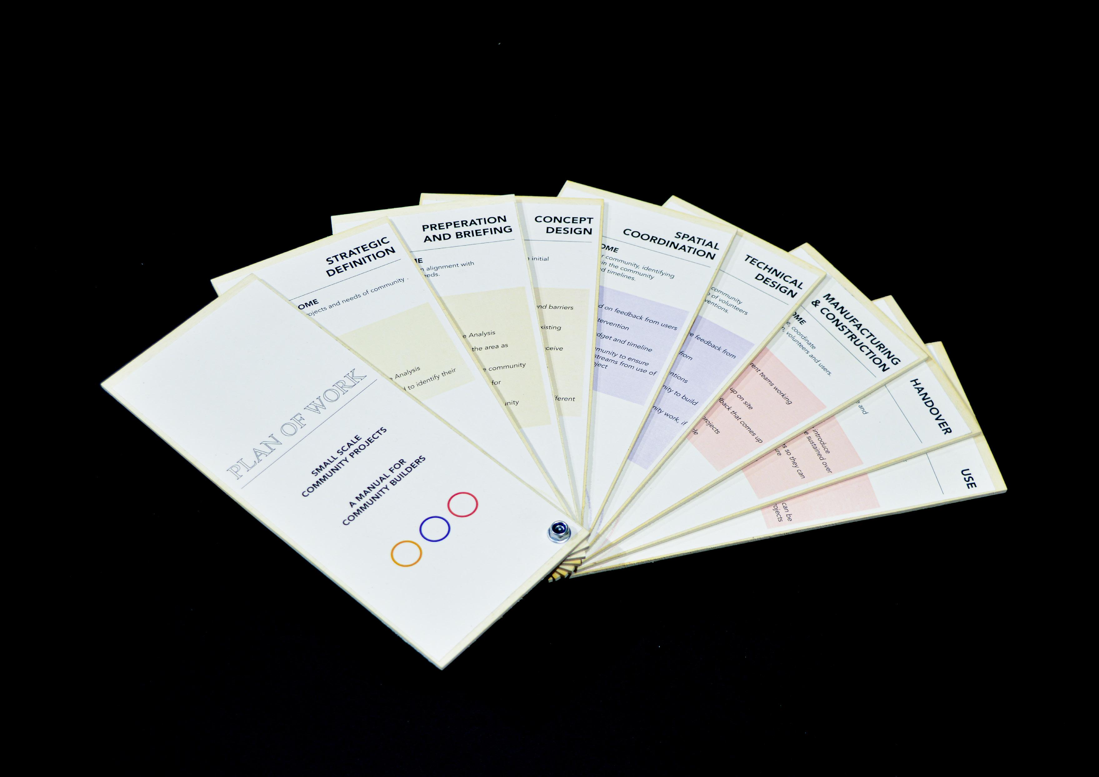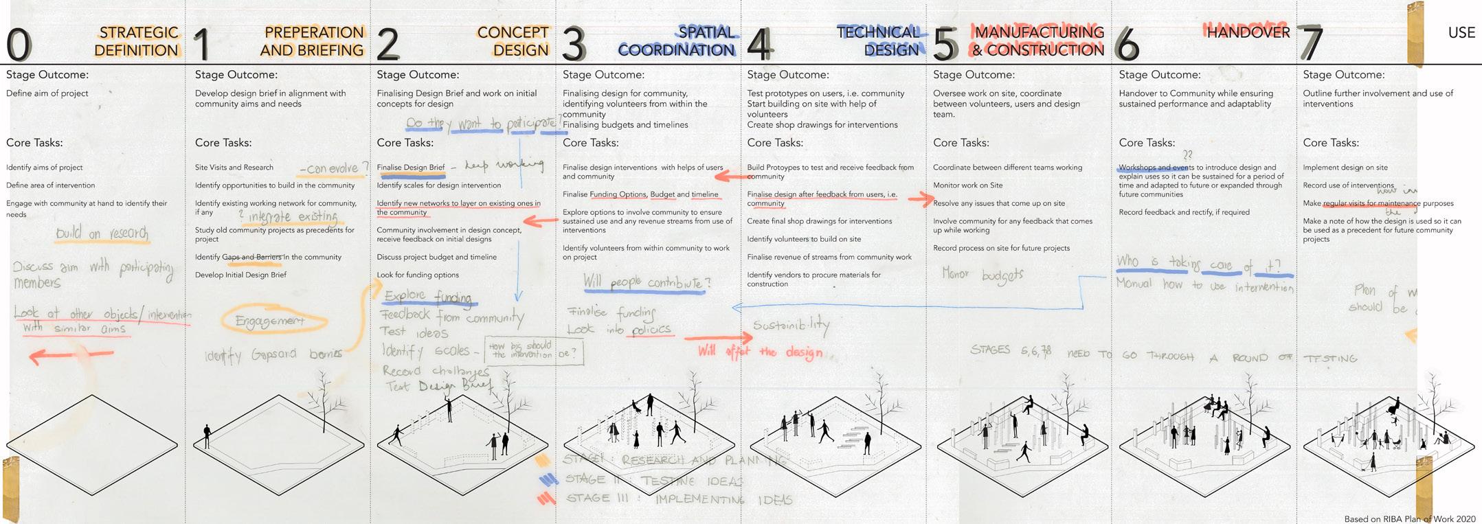RIBA Plan of work provides architects with a tool to organize different stages of a building project throughout its life. Although, it might not be applicable to community projects seeking co-design principals to make the project for and by the community. In such projects a more cooperative, user friendly approach should be followed that may contradict with the somewhat patronizing point of view that RIBA Plan of Work suggests. As a result, we decided to alter this framework to provide a reference for designers and architects as professional facilitators intending to deliver small-scale community projects.