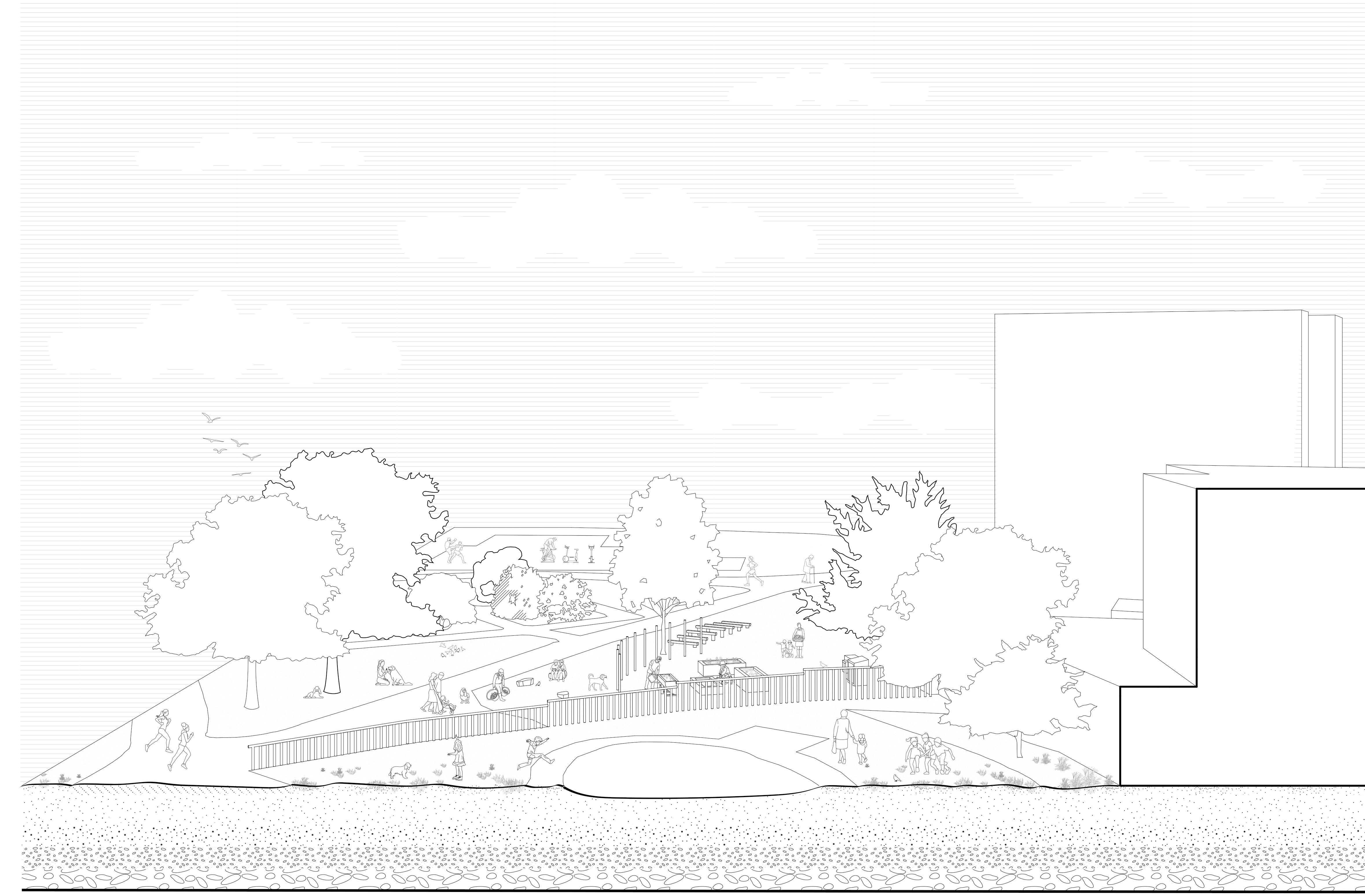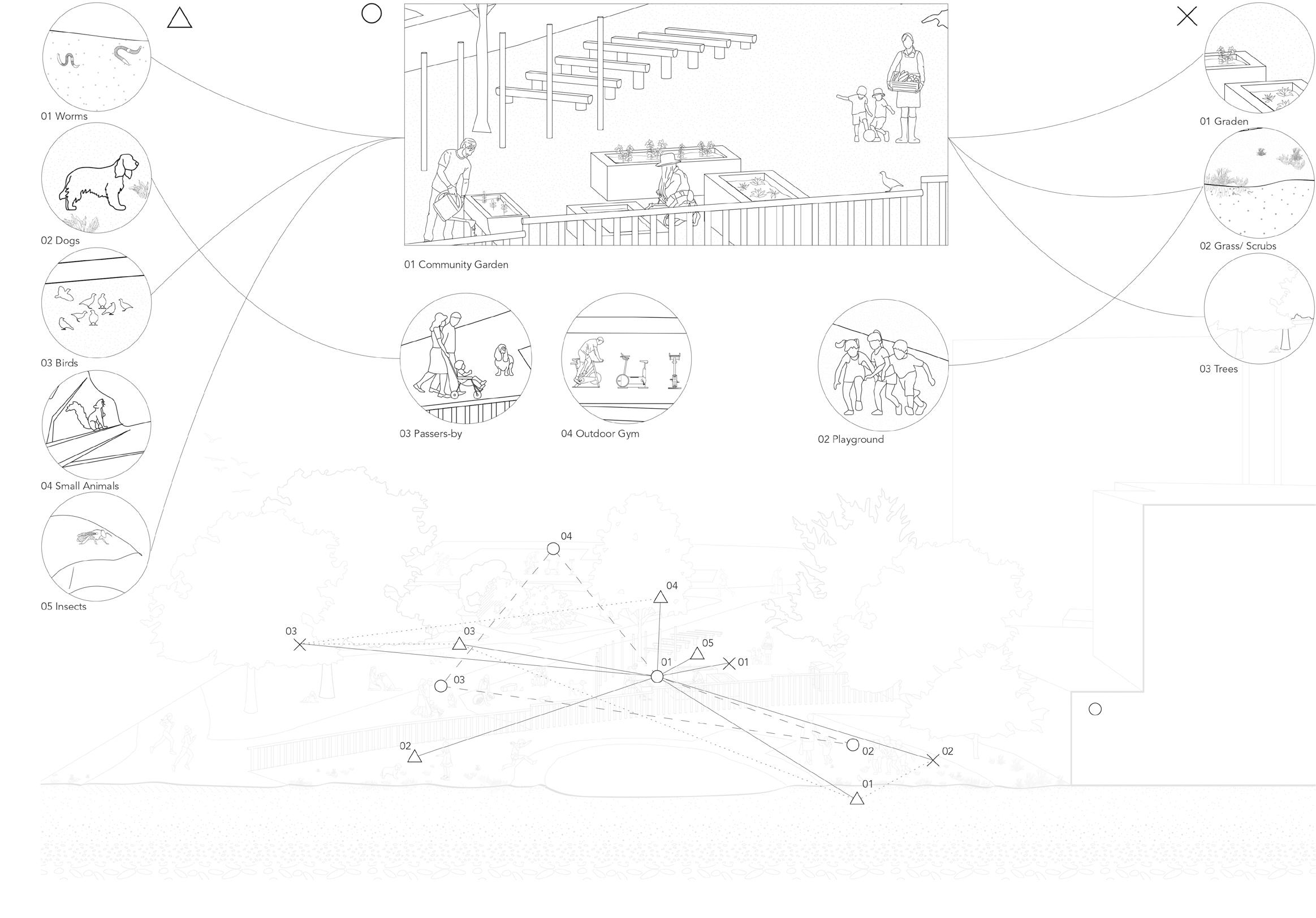Narrowing down the area of our intervention to be more focused, we chose the eastern part of the park including an outdoor gym, a playground and a community project which attracts people from a wide range of backgrounds and age groups. This was a starting point for our project to better understand social, cultural and environmental infrastructure of the chosen site as a scope of a community.