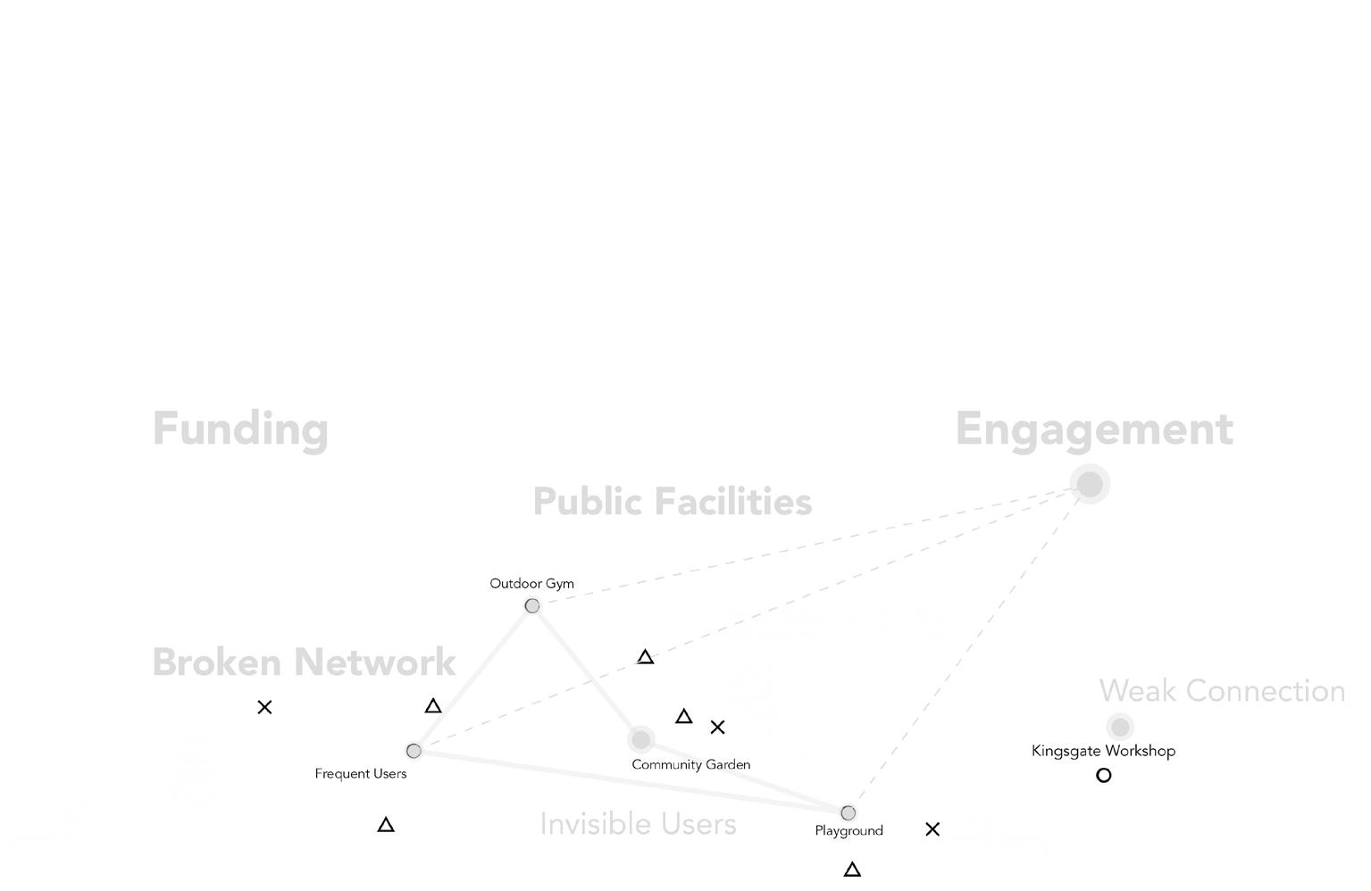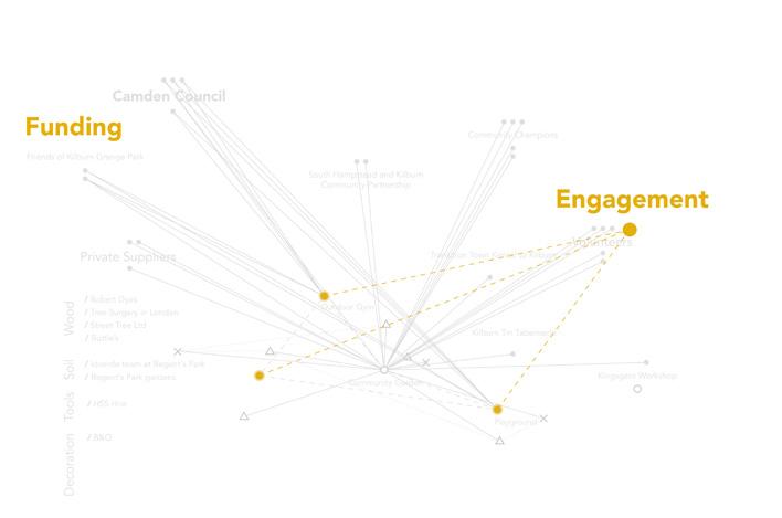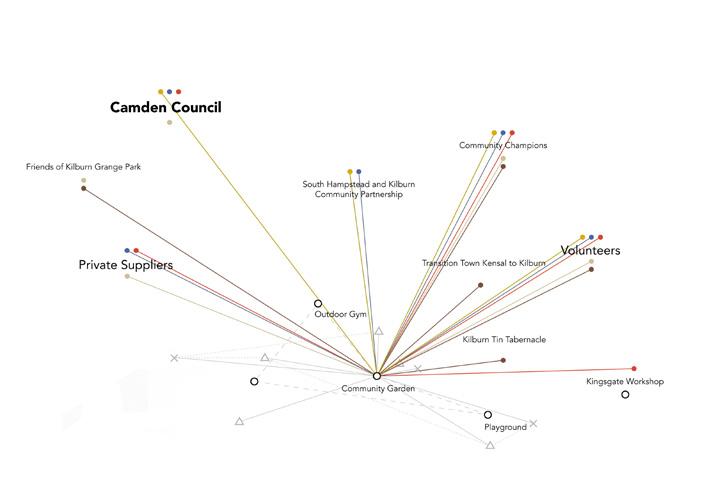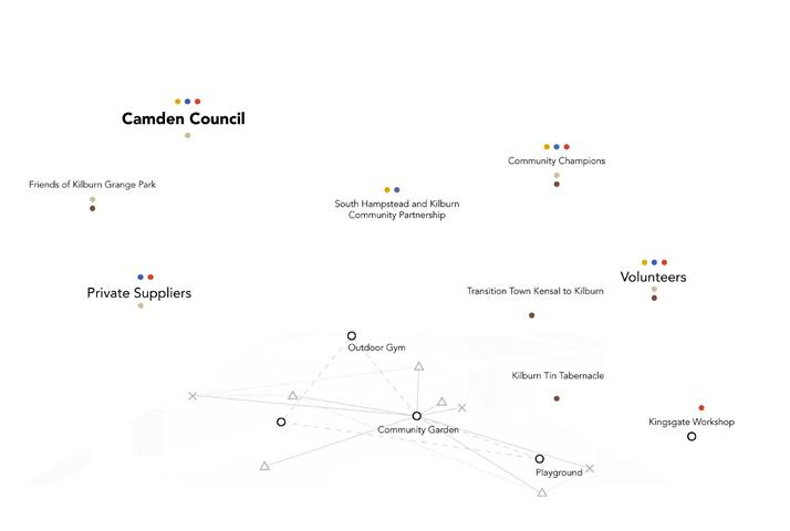INTRODUCTION P. 1 SITE PLACEMENT KILBURN GRANGE PARK P. 7 PLAN OF WORK P. 2 2.01 Summary of Engagement P. 4 2.02 Network Analysis P. 5 STAGE 1 ANALYSIS P. 10 4.01 Summary of Engagement P. 11 4.02 Network Analysis - Visible Network P. 13 4.03 Network Analysis - Invisible Network P. 14 4.04 Network Analysis - Gaps and Barriers P. 15 4.05 Social Activity Analysis P. 16 6 STAGE 2 TESTING P. 17 5.01 Summary of Engagement P. 18 5.02 Initial Design Proposal P. 20 5.03 Information Processing P. 21 5.04 Social Network Analysis P. 22 5.05 Stakeholders Analysis P. 23 5.06 Planning Process with Time Frame P. 24 STAGE 3 IMPLEMENTATION P. 25 6.01 Summary of Engagement P. 26 6.02 Possible Interventions P. 28 6.03 Pop - Up Manual P. 29 6.04 Primary Output P. 31 6.05 Secondary Output P. 32 7 CONCLUSION P. 34