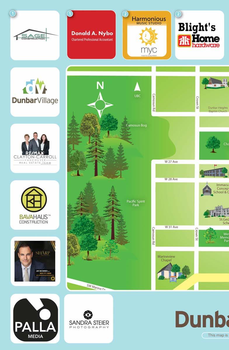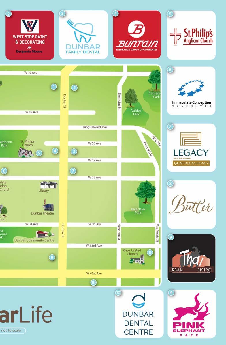 Dunbar Life is produced in partnership with the Dunbar Village Business Association to promote local shopping, dining, services and events. Dunbar borders are between W 16th Avenue in the north to W 41st Avenue in the south, and UBC Endowment Lands in the west to MacKenzie Street to the east. Go to www.issuu.com/pallamedia for an online copy of the magazines. Follow our social media channels of Instagram, Facebook and Twitter for updates.