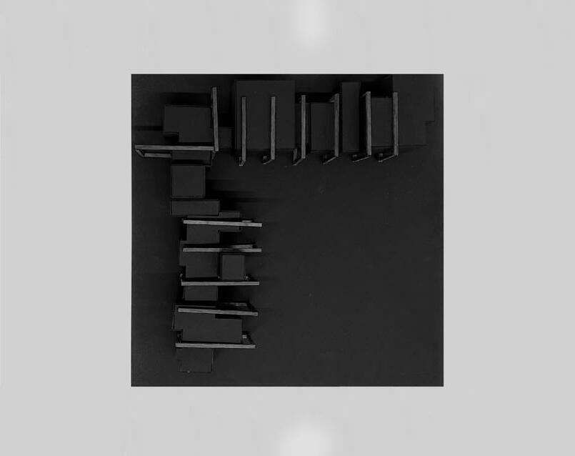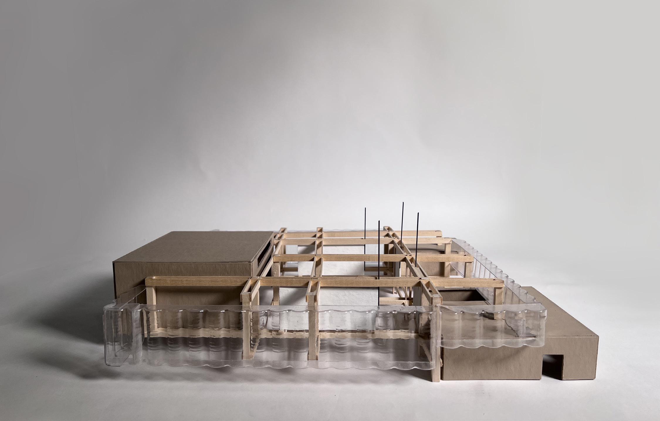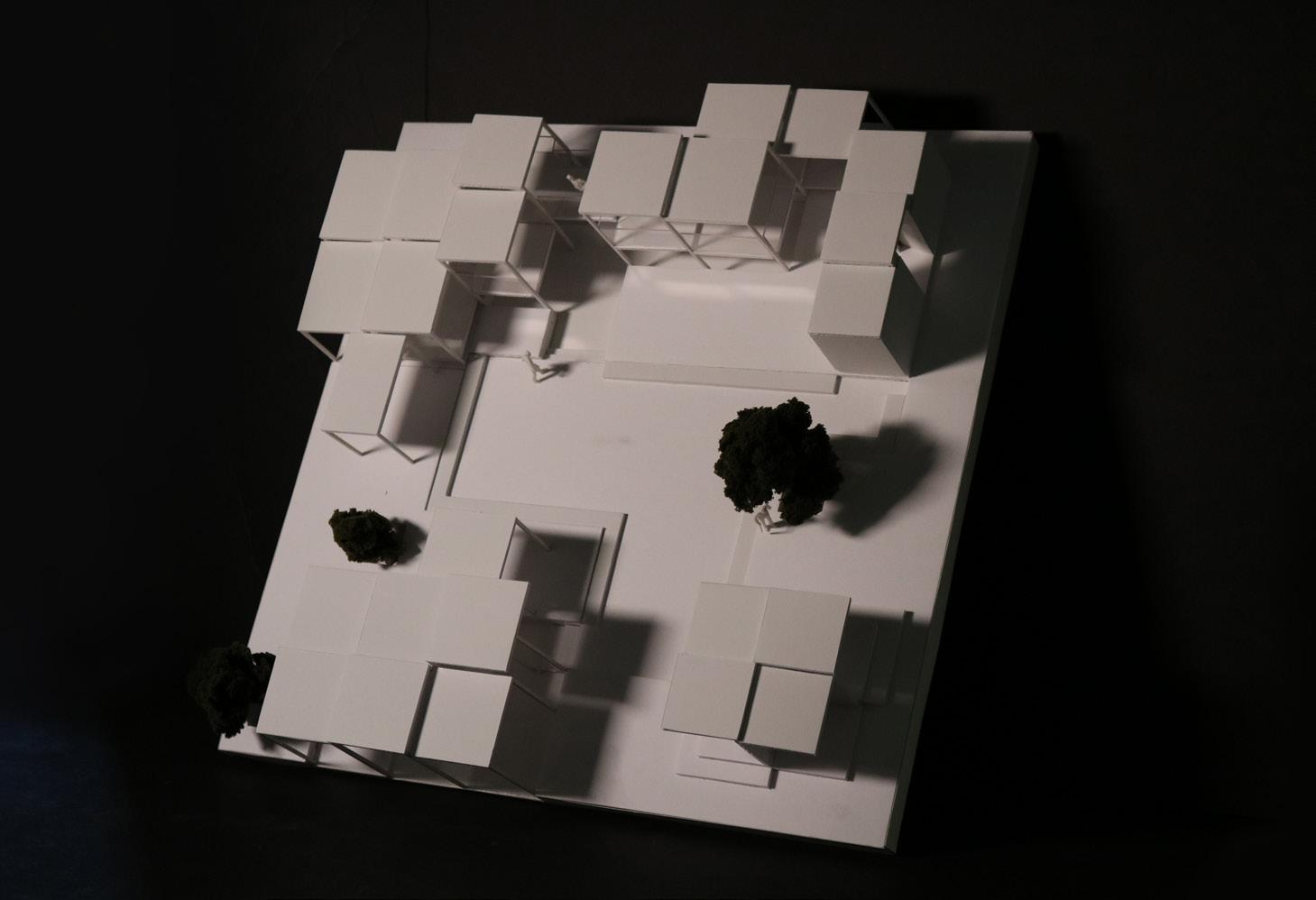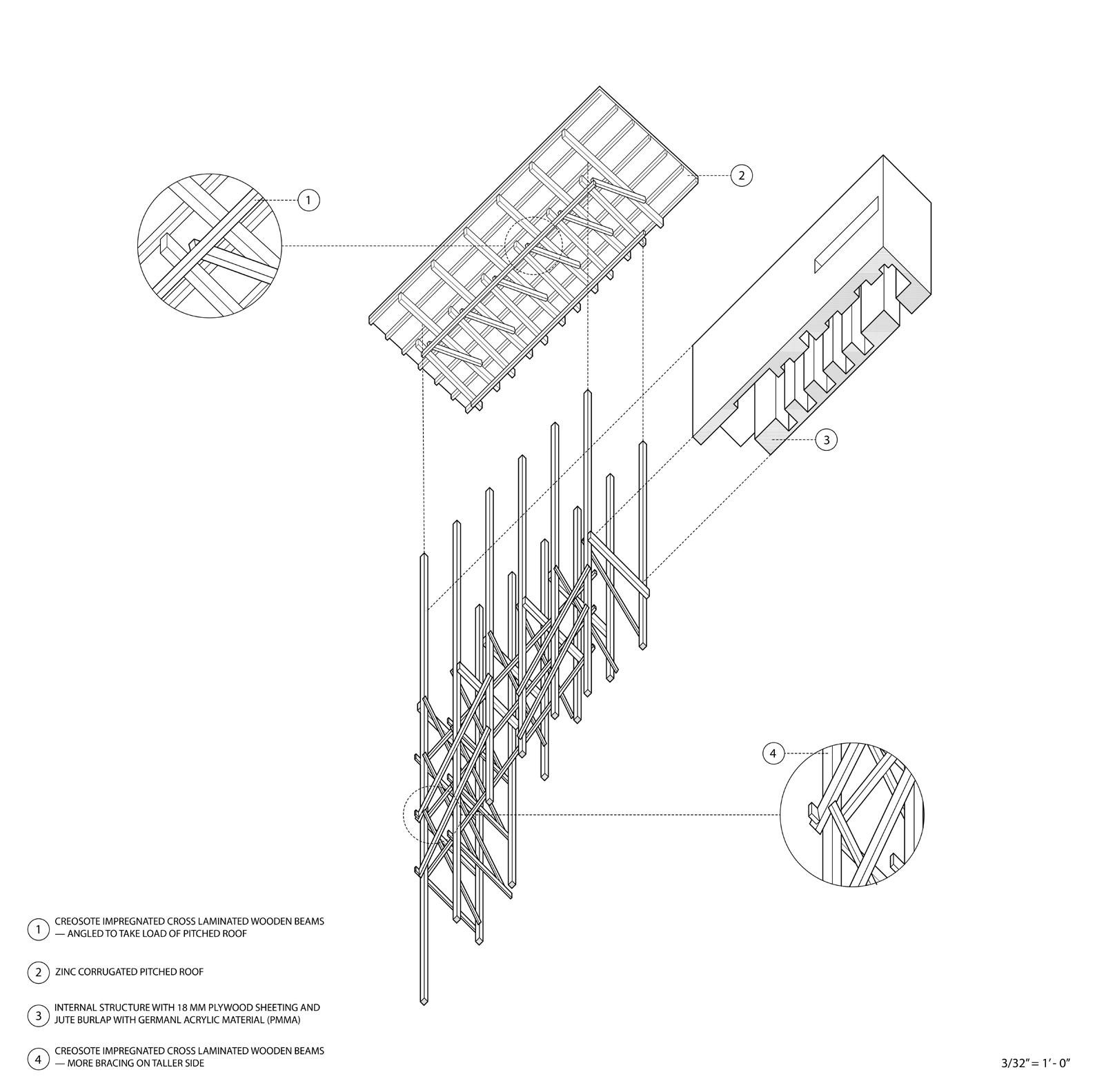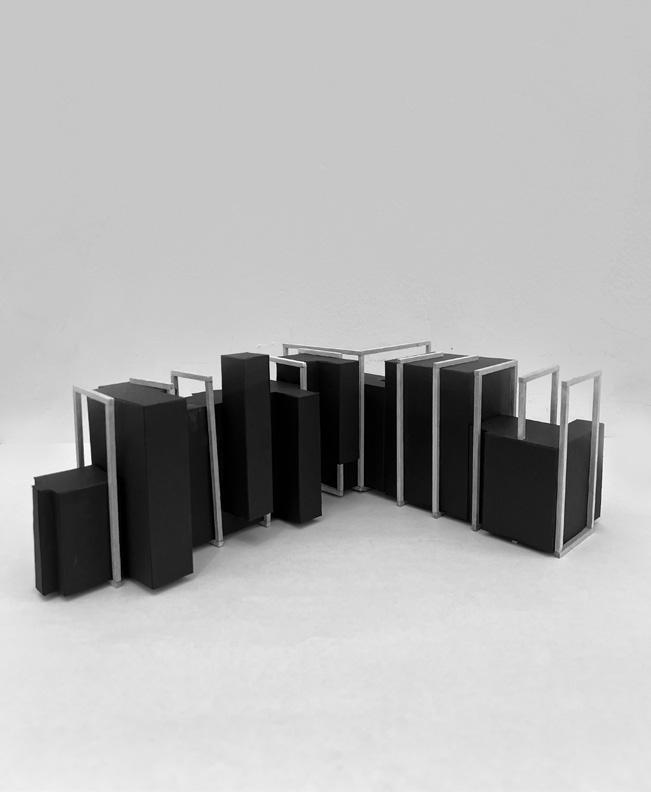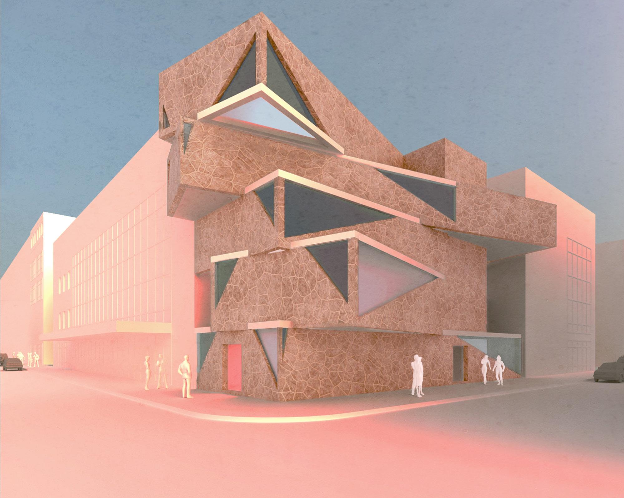 This project is defined by an internal mass that is subtracted from in relation to a rigid external frame that contains the articulated mass moving across and back into the assigned site. A total of twelve cross-laminated timber frames span the length of the mass; at some points creating superimposition and at others intersecting through black powdercoated insulated metal wall panels. Stained wooden slats line the inside of the mass, complementing the exterior frames that pierce through the exterior, while contrasting the dark exterior. While the articulated mass is designed in response to the timber frames and the allocation of program, the timber frame acts as a guideline for both the placement of program and as guide the situation of temporary market vending.