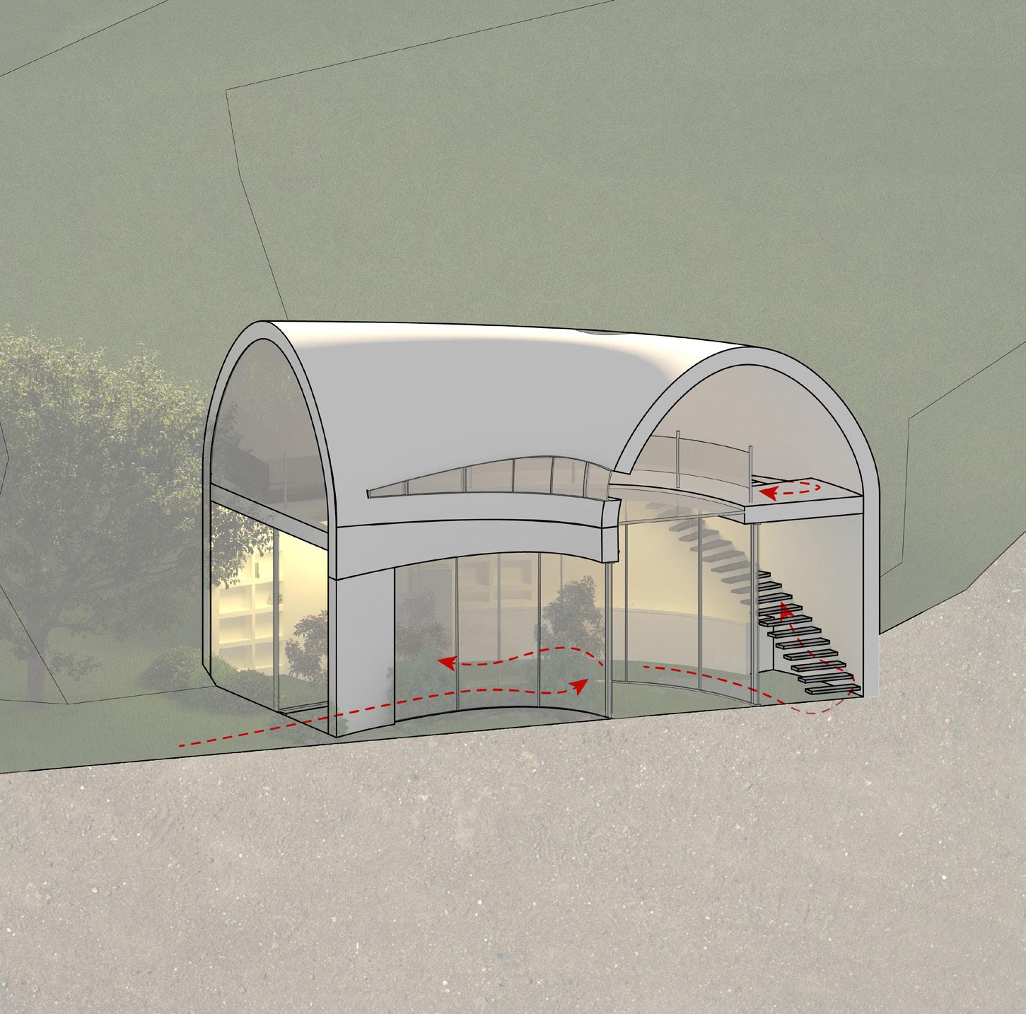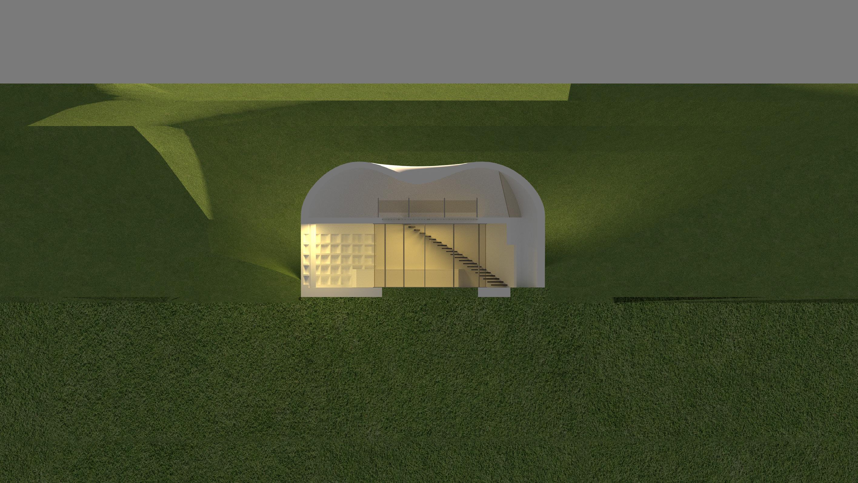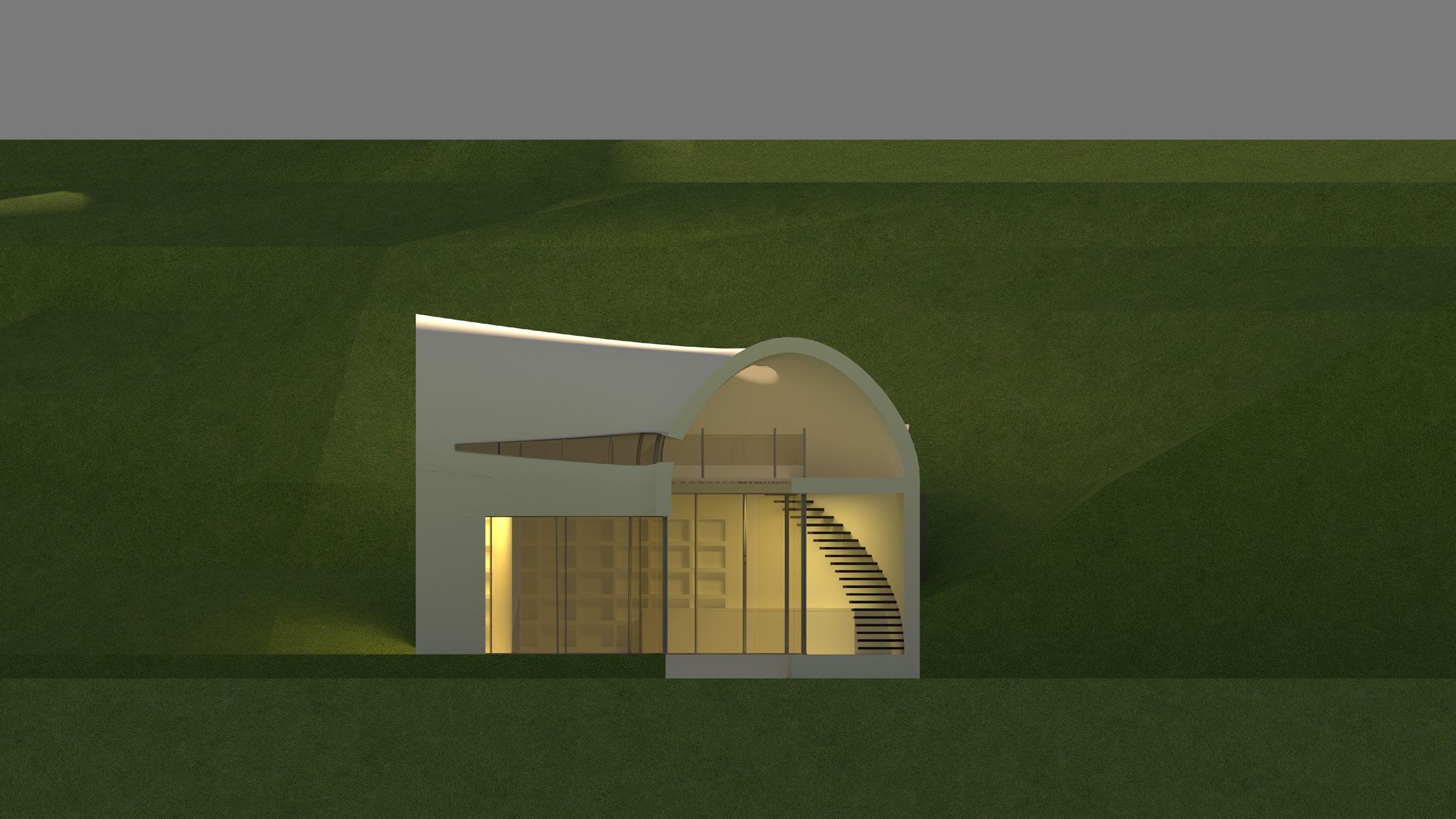The concept for our Micro-Home centered around an aerodynamic body with large openings for seamless transtition between indoor and outdoor spaces. Outlined with plaster polyester, the Micro-Home digs into the base of a hill for improved insulation and for a water collection system in the back. The Micro-Home allows for passive circulation through large window openings and a central skylight. The Micro-Home is self-sufficient in a semi-remote location, just outside of Cornell University.