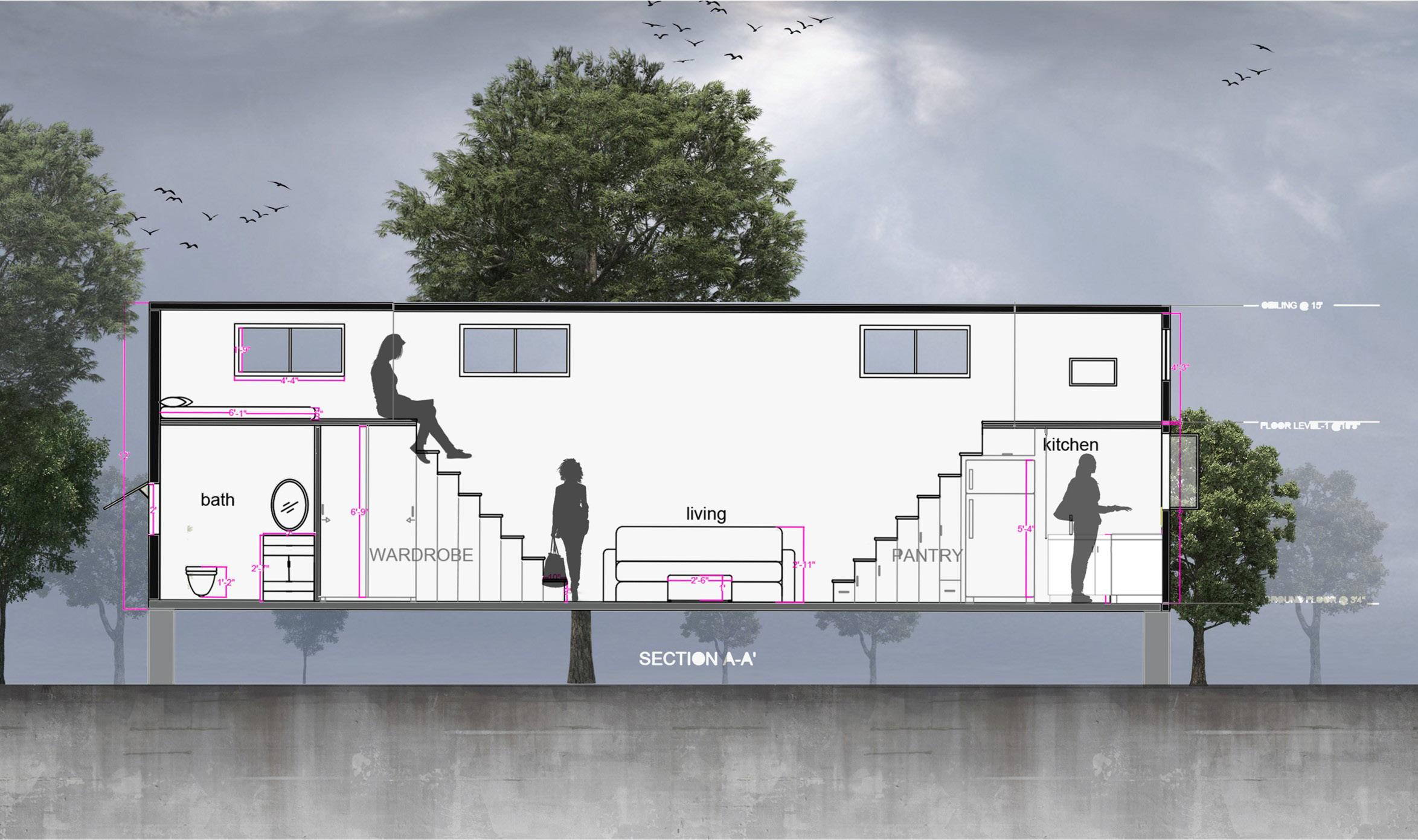 Having to design the space in connection with the context was a key consideration in the design. The space is designed in two levels to minimize space con strains. The lower level of the plan constitutes living area, kitchen, studio space and a bathroom. The upper level constitutes loft bedrooms . The upper level is ac cessed through the stairs that run from the lower level connecting to the upper level. The idea of introducing