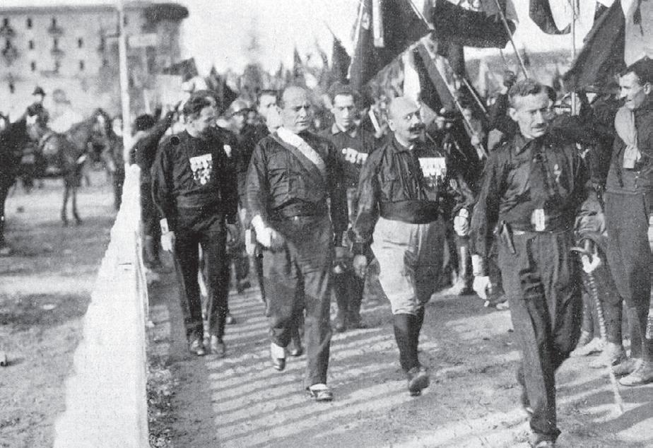 Eén van weinigen die garen wist te spinnen bij dit klimaat van sociale en politieke onrust was de gewezen marxistische agitator Benito Mussolini. Zijn branie, scherpe pen en oratorische talenten maakten van hem de spilfi guur van de Fasci di Combattimento, een groep van militante oud-strijders die luidop droomde van een sociaal geïnspireerde nationalistische revolte.