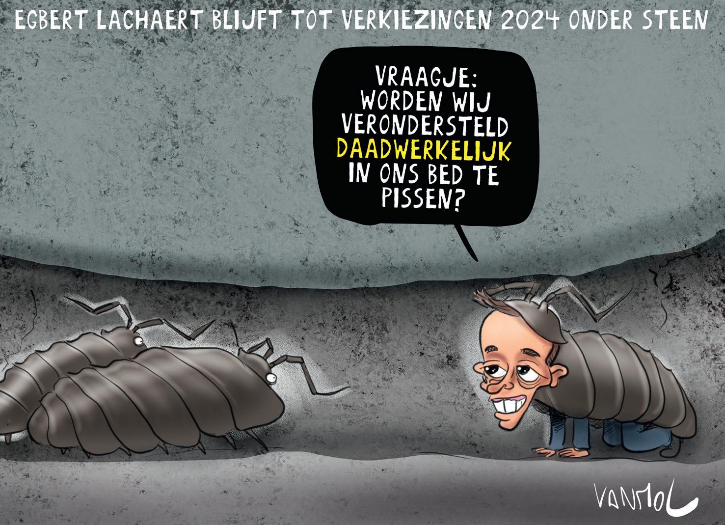 te verhinderen dat Alexander billenkoek krijgt van ieder lid van de liberale familie. “Maar we moeten ons wel allemaal vastklampen aan het schitterend leiderschap van Alexander De Croo”, concludeert Egbert Lachaert vanonder een steen waar hij pas na 2024 onder vandaan komt. Ondertussen maakt de Open Vld van Brakel, waar de De Croos een eigen baronie hebben opgebouwd op de traktaties van vader De Croo en diens illegale pensioenbonus, verwoede plannen om onder een andere naam naar de verkiezingen trekken. Bij voorkeur mag er geen De Croo meer op de lijst tot zeven generaties verder. Reclamebureaus die voorheen verantwoordelijk waren voor schitterende slogans als “Mensen hebben vleugels”, “Goesting in de Toekomst” en “Gewoon Doen” adviseren vandaag de slogan: “Wir haben es nicht gewusst”. En toch blijft De Croo de man van het moment. Hij is immers nog steeds populair in de pop poll… van Brussel en Wallonië. Een beetje zoals een loslopend kippetje populair is op een conventie van hongerige vossen. Ik overdrijf niet als ik zeg dat de enige stem van enige redelijkheid binnen de Open Vld die is van Els Ampe. En daarmee is alles gezegd. 2024 is het jaar dat Verhofstadt met overvolle zakken de politiek verlaat. Zijn partij zal van de gelegenheid gebruik maken om mee te gaan.