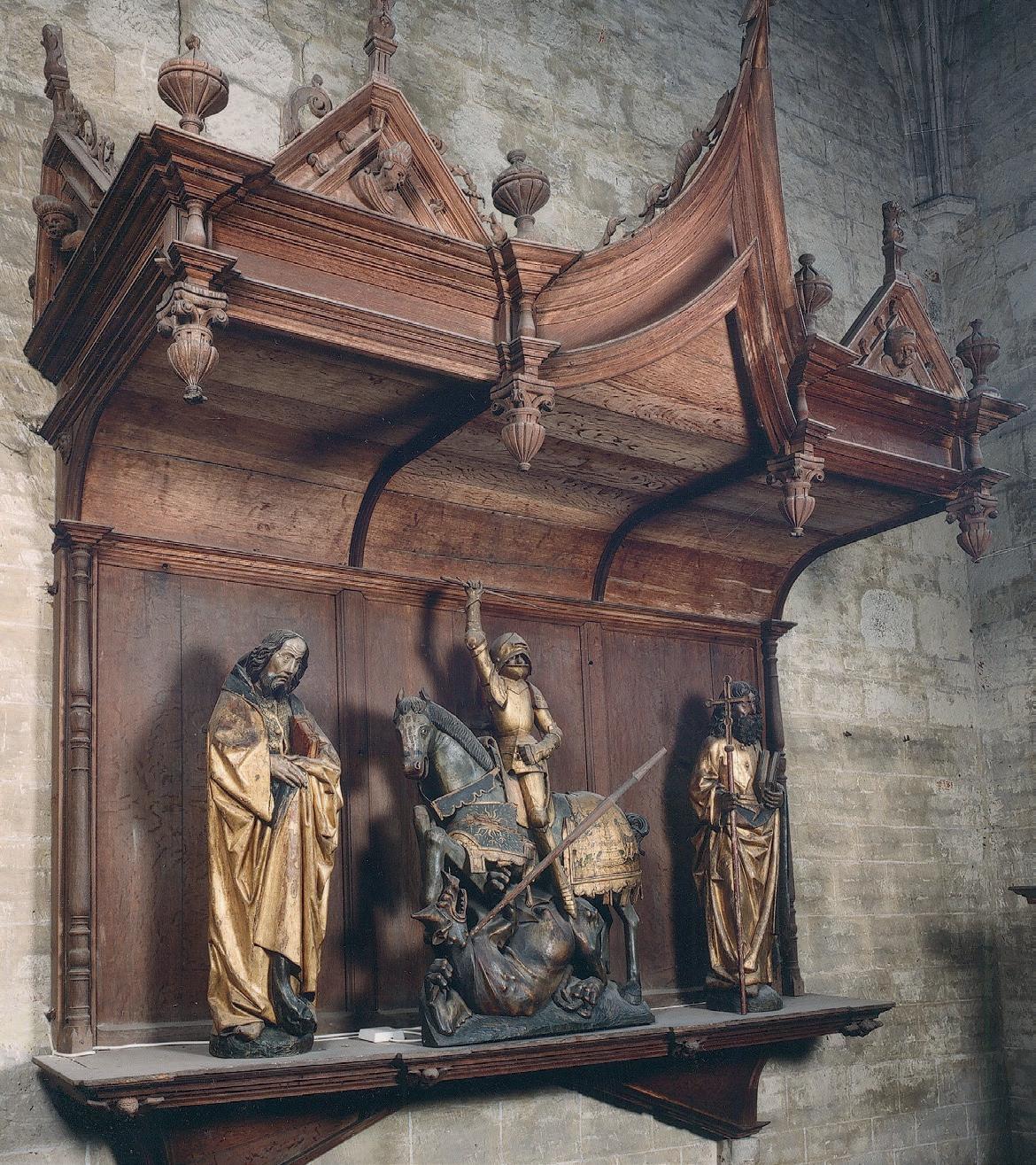 Niet alle kunstwerken bevinden zich nog op hun oorspronkelijke plek in de kerk, maar dat maakt ze niet minder waardevol. Zo zijn drie vijftiende-eeuwse Topstukken samengebracht in een baldakijnconstructie uit de eerste helft van de zestiende eeuw. ‘Sint-Joris die de draak verslaat’ (1486) is van de hand van de Antwerpse beeldsnijder Jan Mertens. De sculptuur maakt indruk door de dynamische en expressieve weergave van het tafereel. Subliem is de dramatiek in de doodstrijd van het monster en het verschrikt steigerende paard. Opmerkelijk is dat het beeld de originele poly-