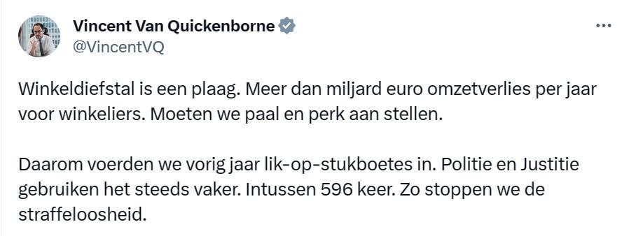 “Winkeldiefstal is een plaag. Meer dan miljard euro omzetverlies per jaar voor winkeliers. Moeten we paal en perk aan stellen. Daarom voerden we vorig jaar lik-op-stukboetes in. Politie en Justitie gebruiken het steeds vaker. Intussen 596 keer. Zo stoppen we de straffeloosheid.” Het is met de grootste trots dat Van Quickenborne nog maar eens een maatregel van iemand anders voor zijn eigen karretje spant. In dit geval was het een omzendbrief van de procureurs-generaal die de door henzelf georganiseerde straffeloosheid bij winkeldiefstallen willen uitbesteden aan de politie. U leest het goed. Er wordt voor meer dan een miljard uit winkels gestolen, maar dat probleem wordt adequaat aangepakt door 30 GAS-Boetes per maand (als Q vorig jaar zegt, bedoelt hij eigenlijk 20 maanden) te laten uitschrijven door de wijkagent aan de lokale supermarkt. “Wat zijn we fantastisch bezig”, kraait de minister. Je kan het