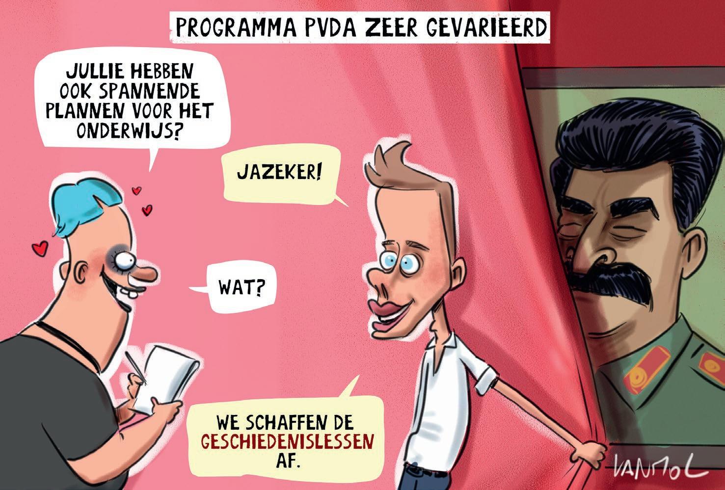 “Een vrij Palestina ‘from the river to the sea’, de NAVO die moet ontbonden worden, meer visa voor vrijheidsstrijders die verkeerdelijk als terroristen worden gezien, strenge straffen op polariseren, het opheffen van invoertaksen op Chinese superieure producten en als er tijd over is: propere straten of zoiets. Je moet ook niet alles vastleggen in een programma. Je moet ook ruimte laten voor de prioriteiten van de coalitiepartners. Zie je nu, dat is het soort moderne partij dat we vandaag