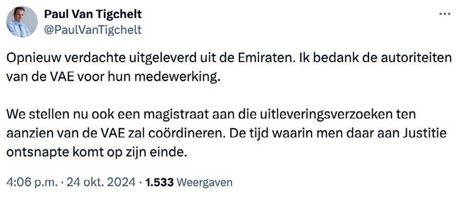 “Opnieuw verdachte uitgeleverd uit de Emiraten. Ik bedank de autoriteiten van de VAE voor hun medewerking. We stellen nu ook een magistraat aan die uitleveringsverzoeken ten aanzien van de VAE zal coördineren. De tijd waarin men daar aan Justitie ontsnapte komt op zijn einde.” De tweet van Paul Van Tigchelt is leugenachtig op zo veel niveaus. Het klopt dat er een verdrag is gesloten met de Emiraten om Belgische verdachten over te leveren aan ons land. En toch wemelt het er nog steeds van drugsbaronnen die niet bepaald onder de indruk zijn van die tweede uitlevering.