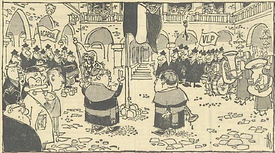 13 september 1952: Goddank “Na twee maanden zonder te zijn geweest, hebben onze Nederlandse (bene)-luxebroeders eindelijk een nieuwe regering. Kameraad Drees de socio, zal met de katholieke Beel als rechterhand en liefst maar twéé ministers van buitenlandse zaken, Nederland ter zege voeren. Maar die verdubbeling van het aantal ministers van buitenlandse zaken in een klein landje dat op buitenlands gebied niks meer in de pap te brokken heeft, is wel een goeie mop.”
