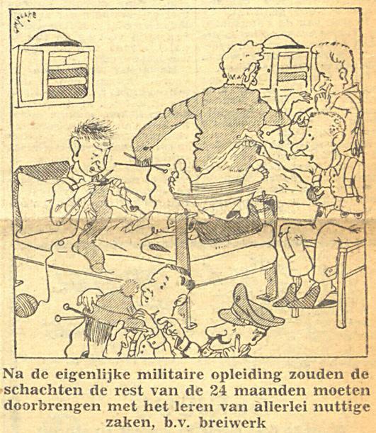 1 maart 1951: de 24 maanden Rond deze periode werd in het parlement gedebatteerd over het verlengen van de periode waarin jongemannen de militaire dienstplicht zouden moeten vervullen. ’t Pallieterke was duidelijk tegen. “Wij zijn zo moedwillig er aan te twijfelen dat er zelfs nog acht maanden nodig zullen zijn om van onze rekruten volwaardige soldaten te maken”, schreef de ‘militaire medewerker’ dr. J.D.D.T. Brombouts op de voorpagina. “Een moderne oorlog kan gewonnen worden door het eenvoudig uitstrooien van nagels op de wegen waarover de vijandelijke autokonvooien alleen ’s nachts kunnen rijden, dus zien wij niet waarom onze jongens nog gedurende acht maanden met hun proper gewassen voeten zouden moeten laten spelen.”