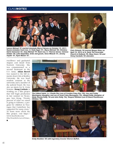 excellence and graduated magna cum laude from Norwich University. She was commissioned as a second lieutenant in the U.S. Army. Adam Bessel was named to the fall semester dean’s list at Bentley University. He was head resident assistant at the university and a member of the judicial board. He was also an intern for St. Croix Systems. Doug Cushnie is working on a film project that will begin production in late summer in Nicaragua. Says Doug, “Twenty percent of what we raised is going to Fabretto, a program for children in Nicaragua that Canterbury has supported for many years.” To learn more about the film project, visit https:// www.facebook.com/ TheNinthOctaveFilms.