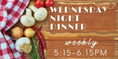 Wednesday Night Dinners are served every Wednesday in the Fellowship Hall between 5:15 and 6:15. All are welcome! The cost is $5/adult, $3/child, or $15 max per family.