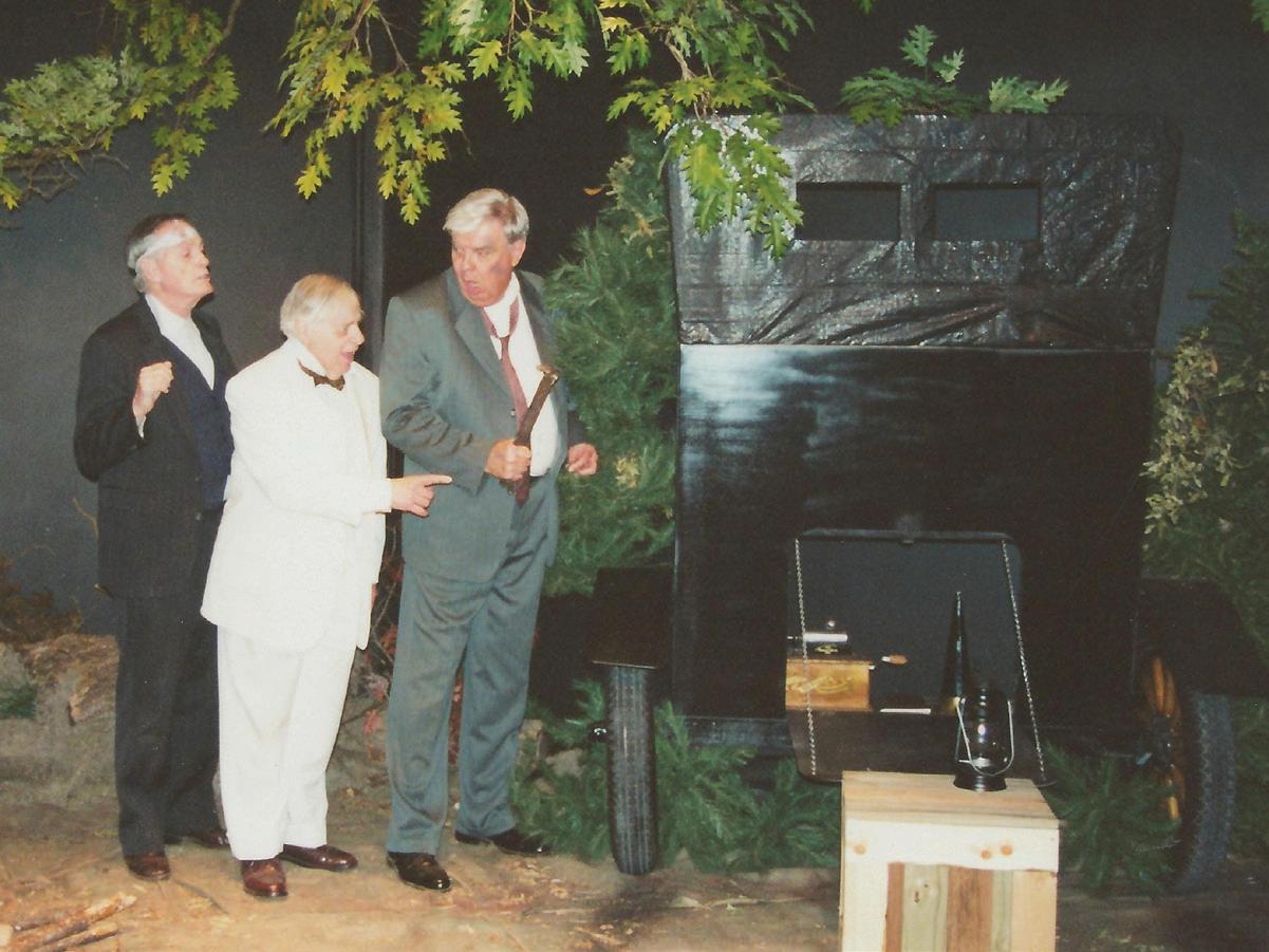 This popular production featured (left to right) Jim McConville as Henry Ford, Charles Newman as Thomas Edison, and Hal Johnstone as Warren G. Harding. It was performed at our 45-seat theatre with a postage stamp-sized stage, yet we found room for a Model-T Ford. OK, not exactly. It was the back end only, designed by William Weld, who built many props for PBD over the years. It was made of wood, but the wheels were authentic, borrowed from a car collector. Our revival this season will undoubtedly look a lot different!