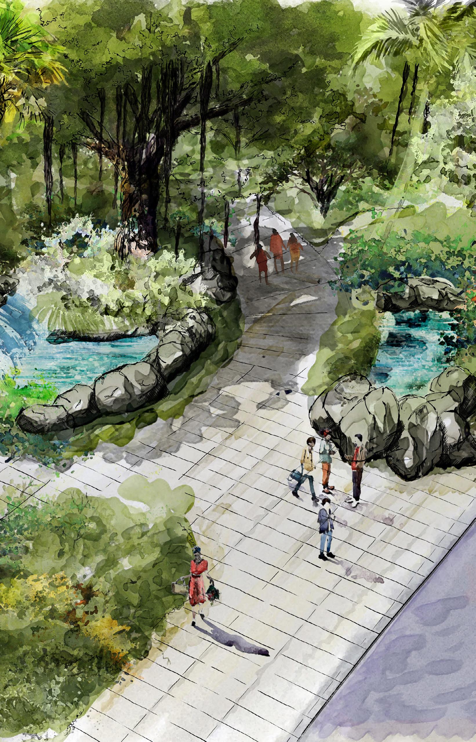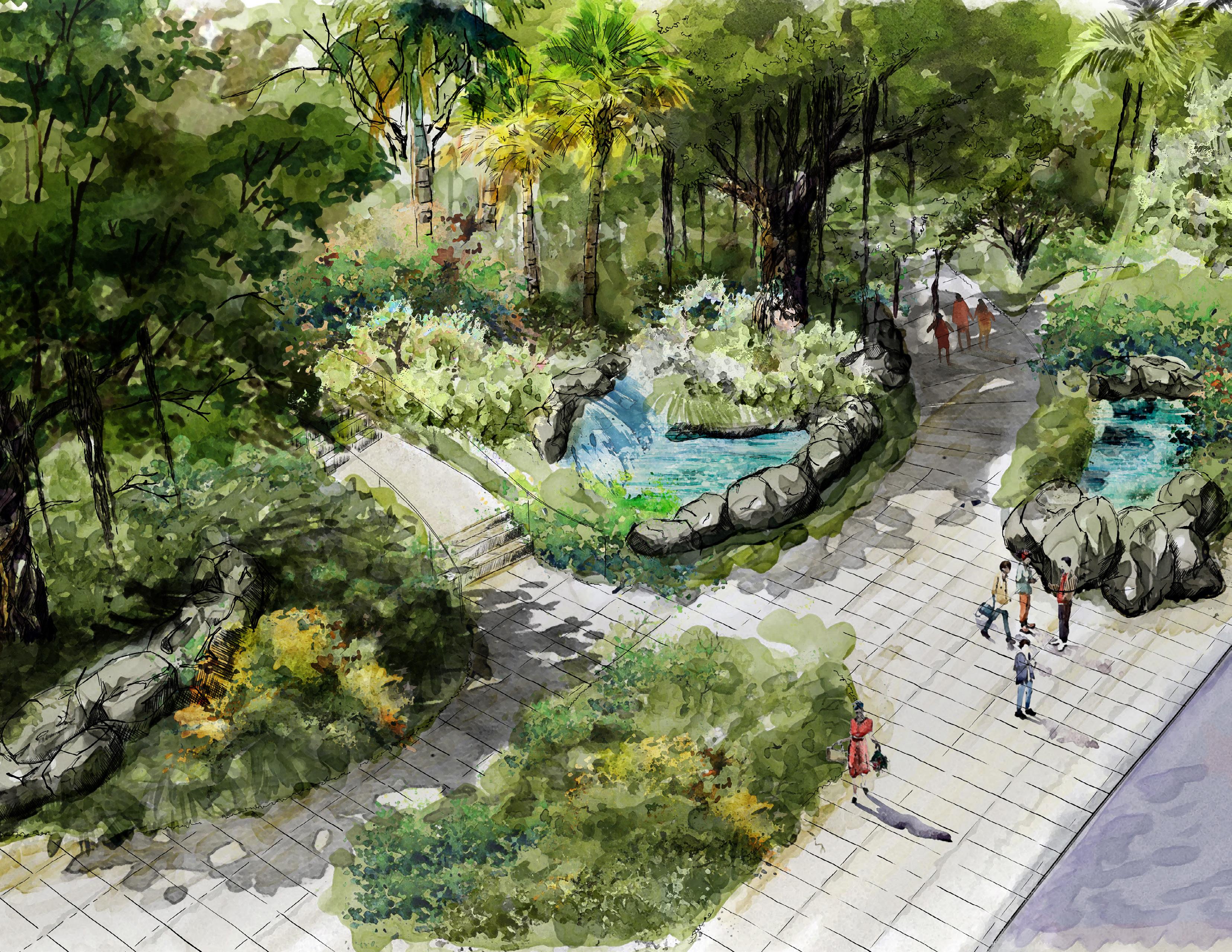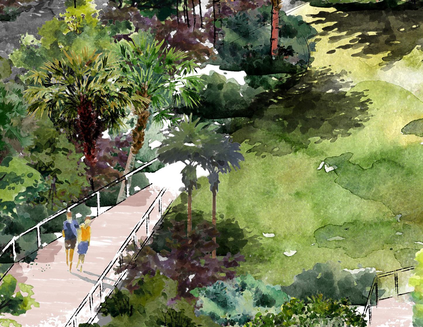 A transformative space at the entrance to the park with the mission of receiving rainwater from nearby green spaces. The space will become one of restoration, a model for adaptation and resiliency