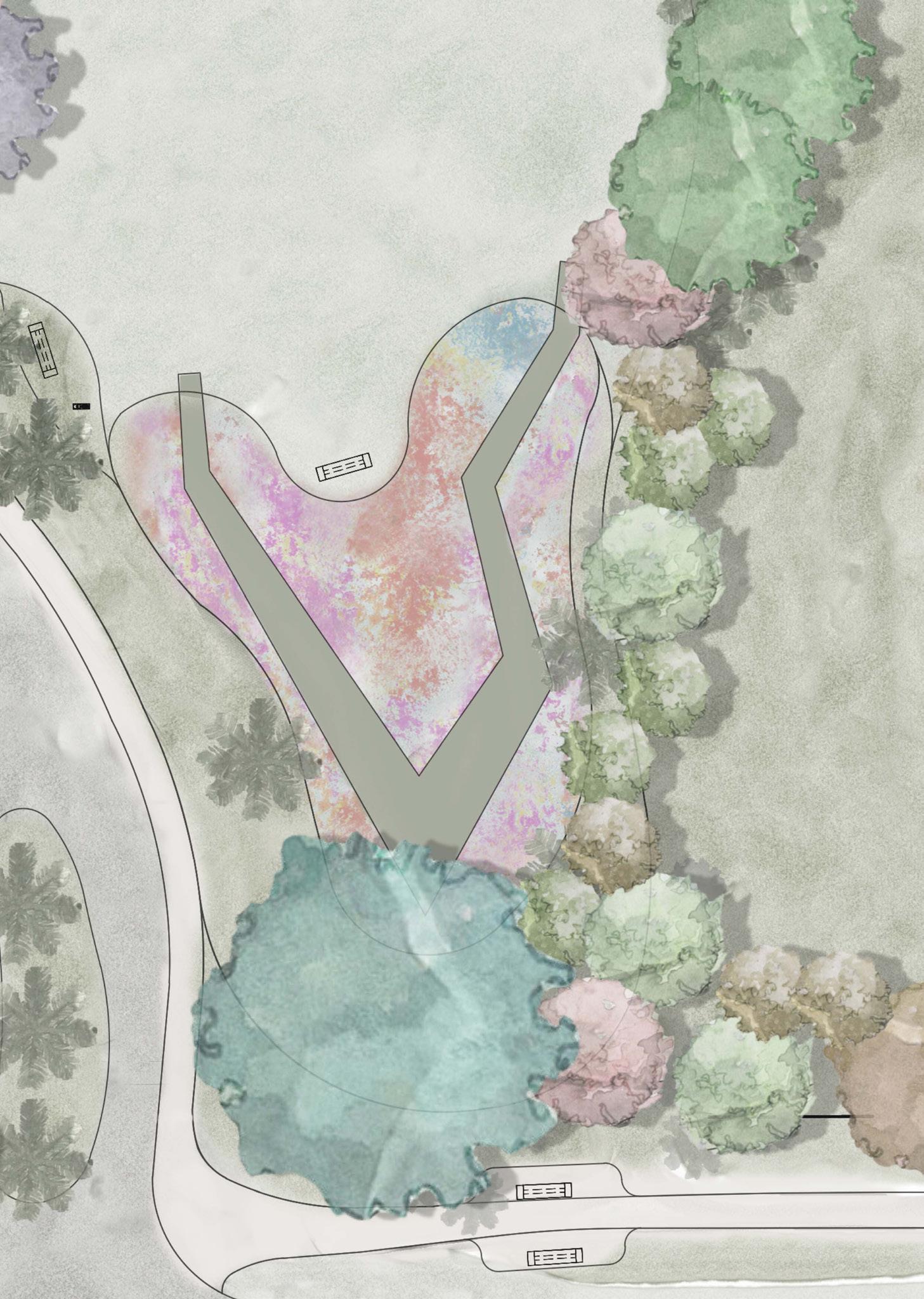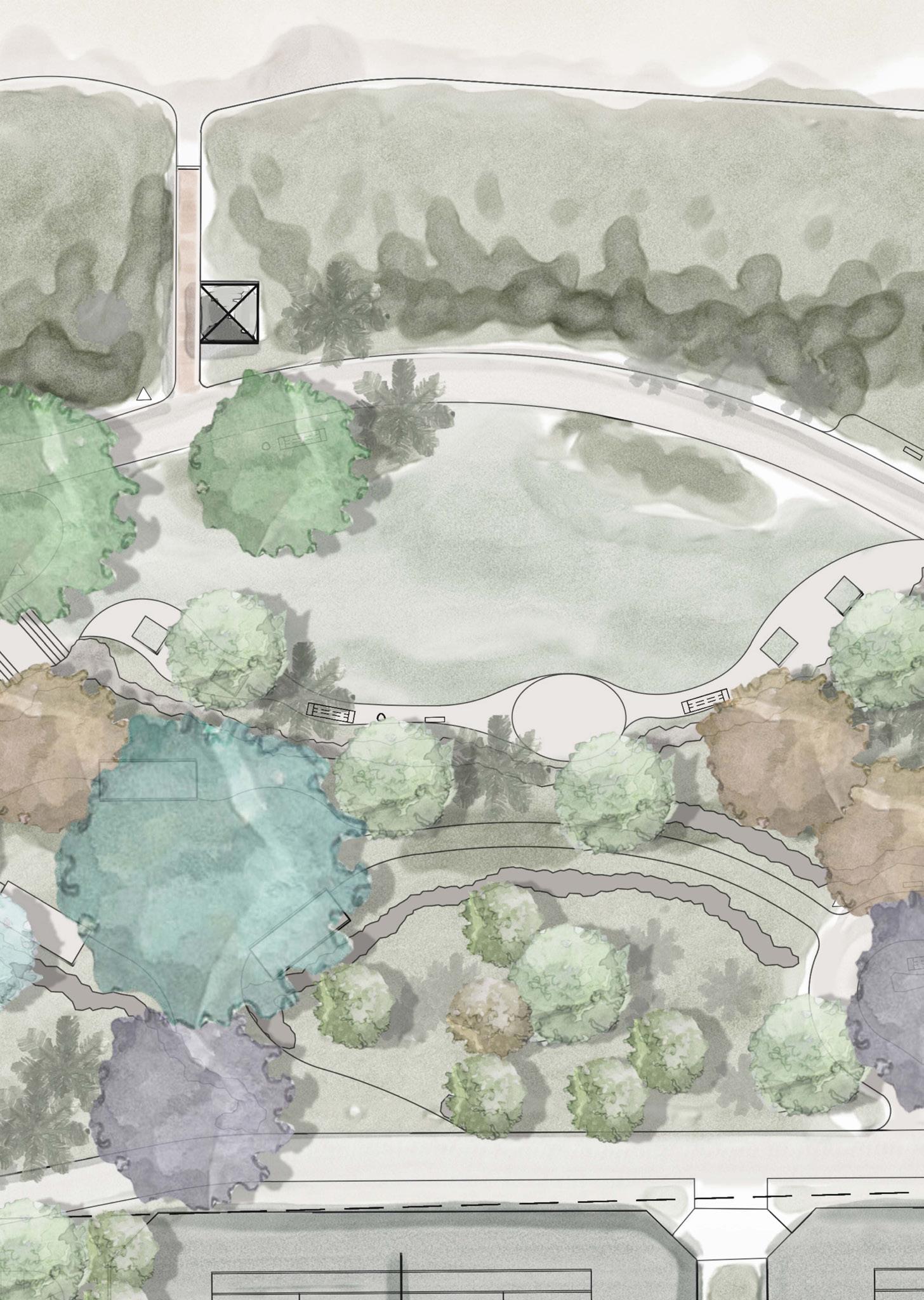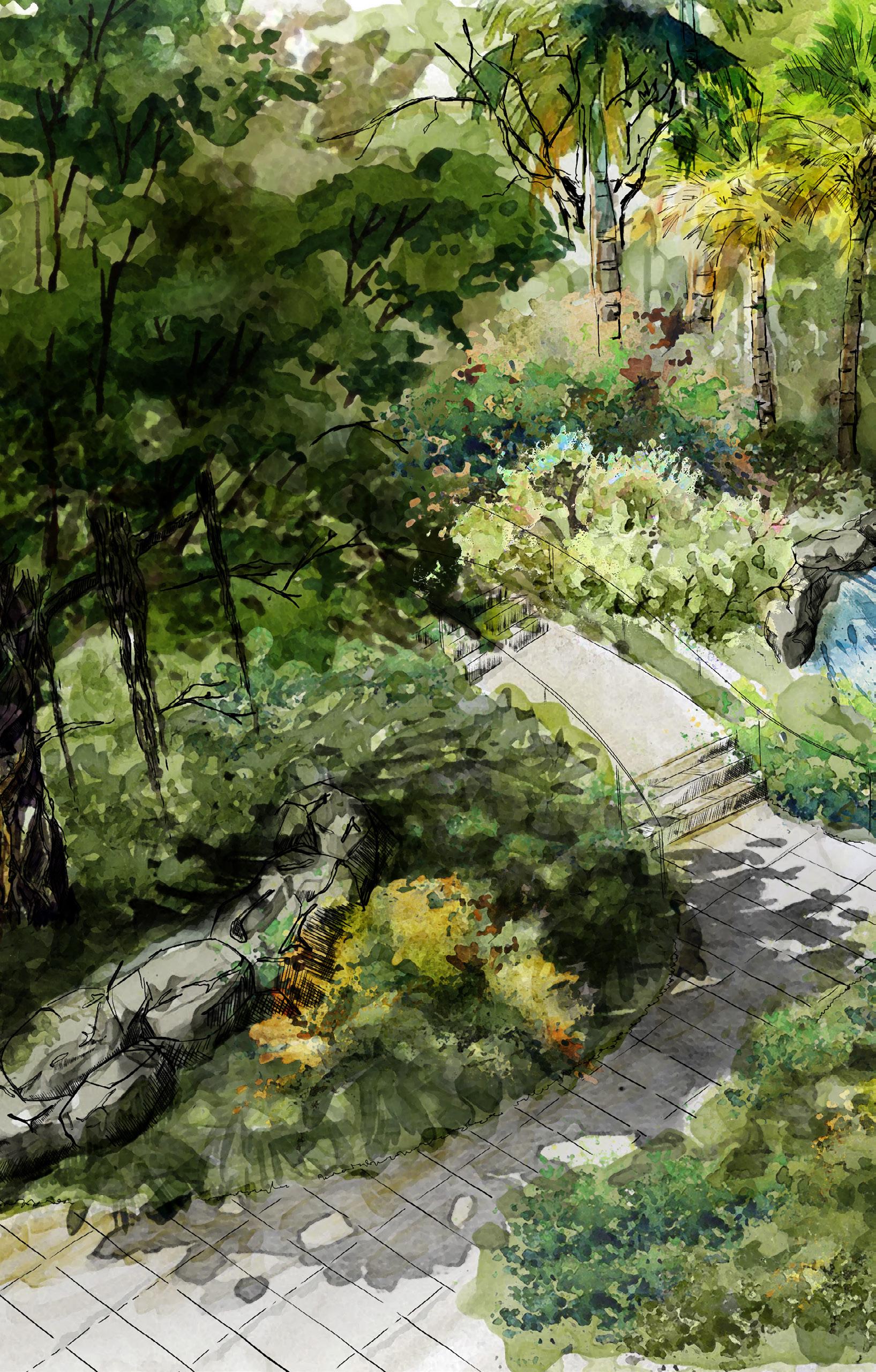 A transformative space at the entrance to the park with the mission of receiving rainwater from nearby green spaces. The space will become one of restoration, a model for adaptation and resiliency