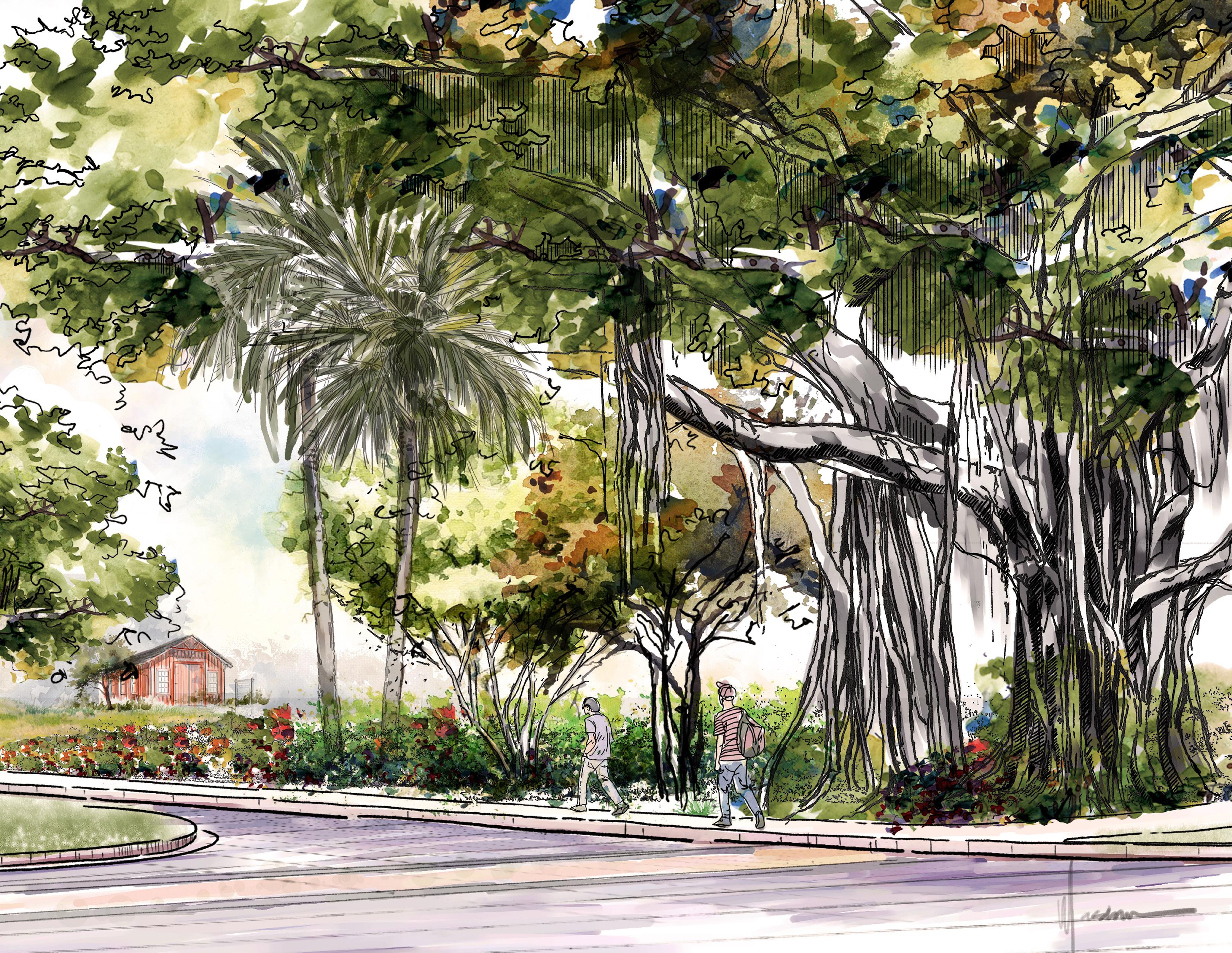 The legacy Strangler Fig tree marks the pedestrian entryway, the place where all trails and paths meet