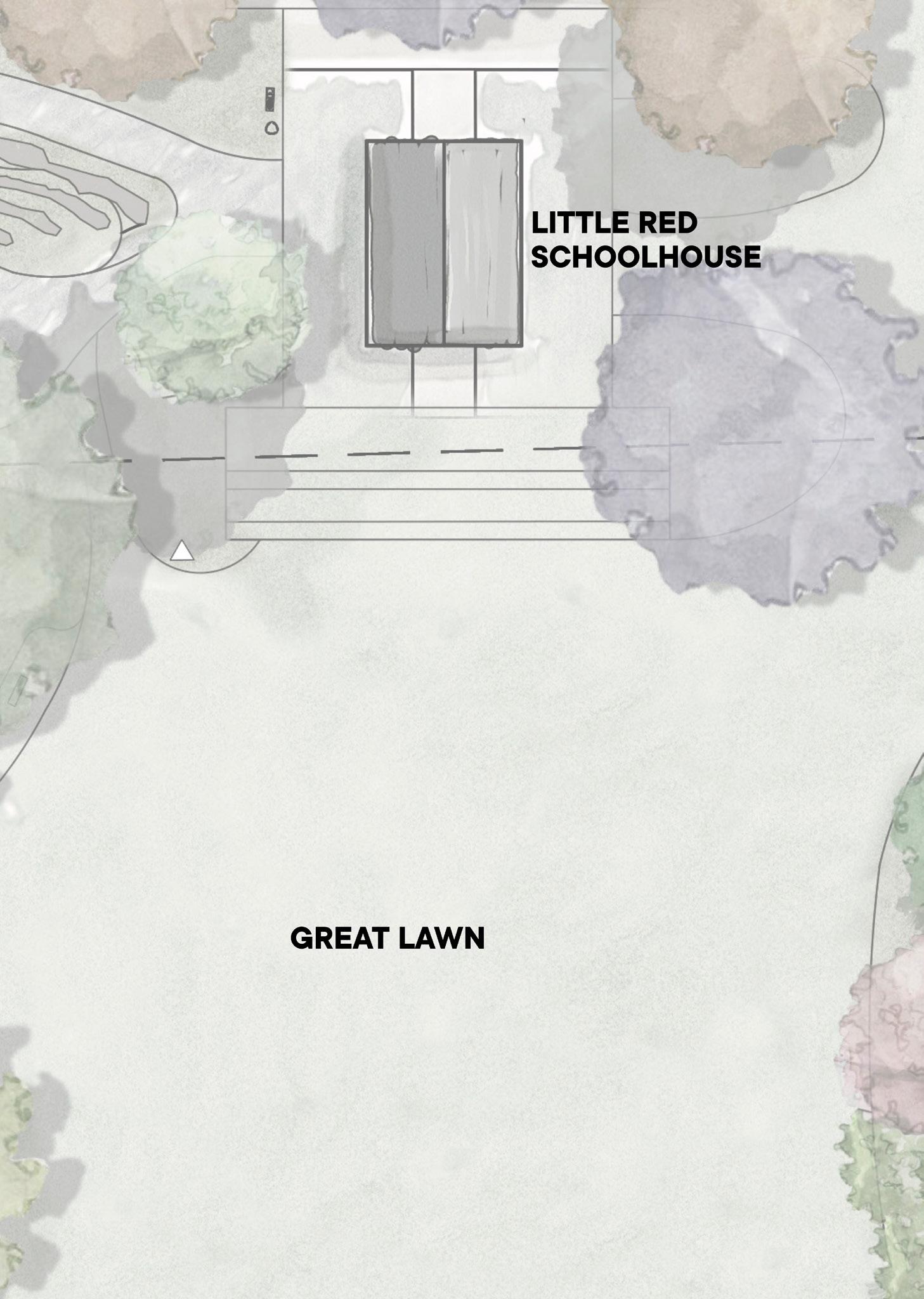 • Passive green space that creates a gracious recreational facility and offers sight lines to the Little Red Schoolhouse from across the park