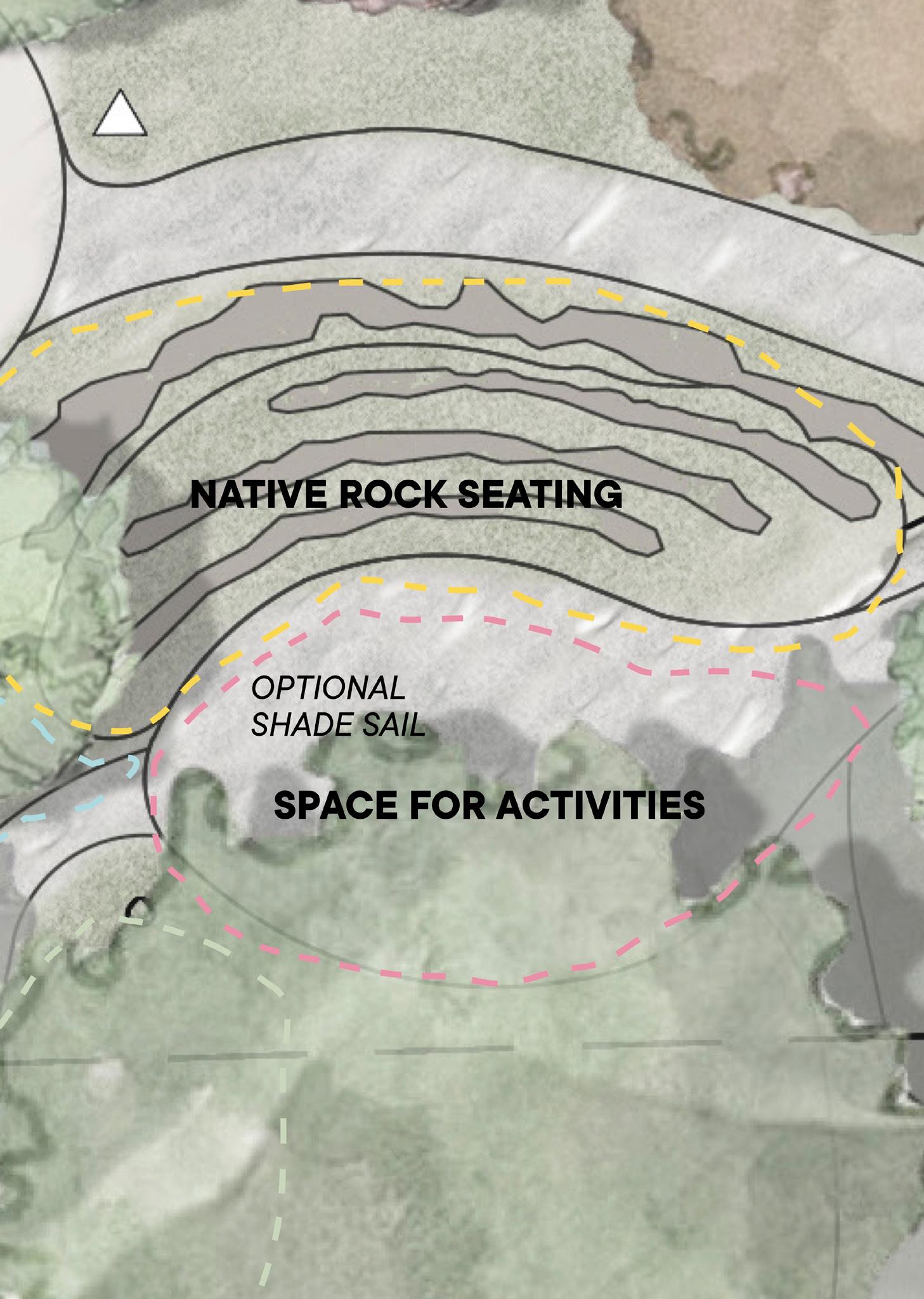 • Main open space for activities with native stone used to create seating elements