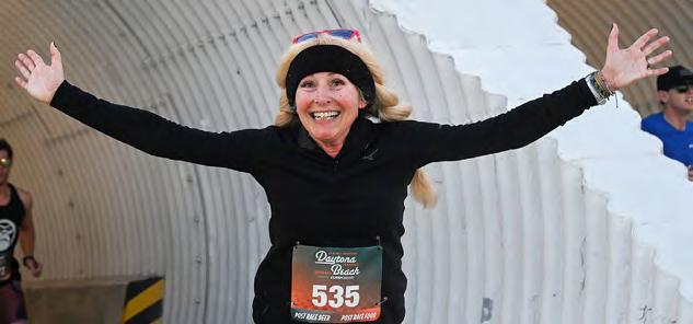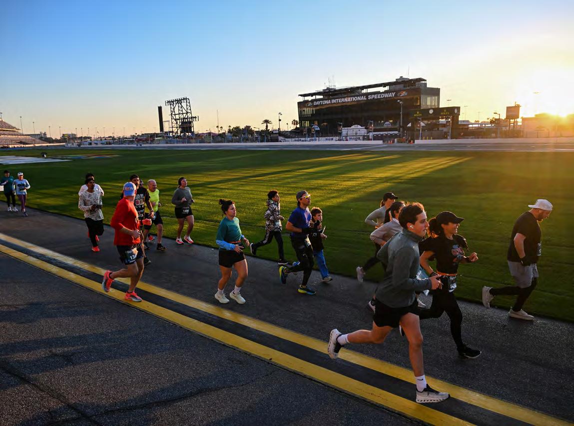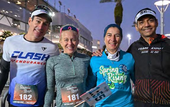 Landon Liedtke (center) and Sheyla Fisher (right) run to grab their medals at the One Daytona finish line of the Clash Endurance half-marathon on Saturday, Feb. 7.. Photo by Michele Meyers