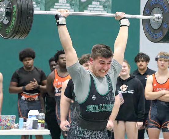 Cody Strawser clean and jerks 230 pounds. His best clean and jerk at the meet was 250 pounds. The junior won both competitions in the 129-pound weight class. Photos by Brent Woronoff