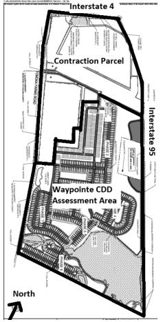 (NOTE: The District is undertaking a process to remove certain property (“Contraction Parcel”) from within the boundaries of the District that are planned for commercial and apartment development because such areas will not be part of the CIP, and, as such, these areas will not be subject to the Debt Assessments.) A geographic depiction of the District is shown below. All lands within the District are expected to be improved in accordance with the reports identified above.