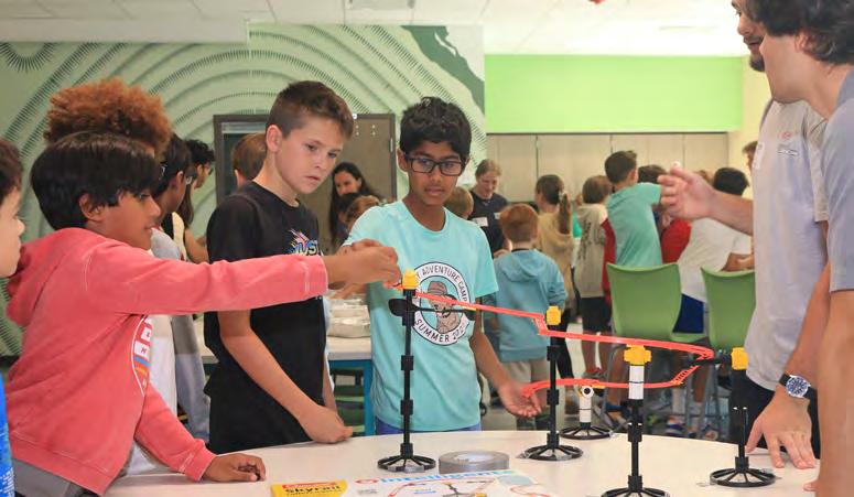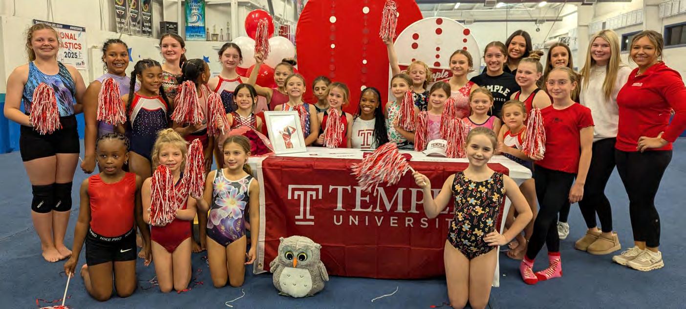 Kaiya Brown (second from left) with Palm Coast Gymnastics teammates Anna Schwartz (left) and Eva Iannarelli (right) with Coach Kelly Flagler. Photos by Brent Woronoff Palm Coast Gymnastics athletes celebrate with Kaiya Brown (center) at her signing ceremony. Brown signed a full gymnastics scholarship with Temple University.