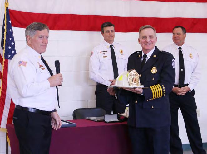Interim Fire Chief Dave King presents retired Fire Chief Richard Sievers with a helmet at his last achievement ceremony.