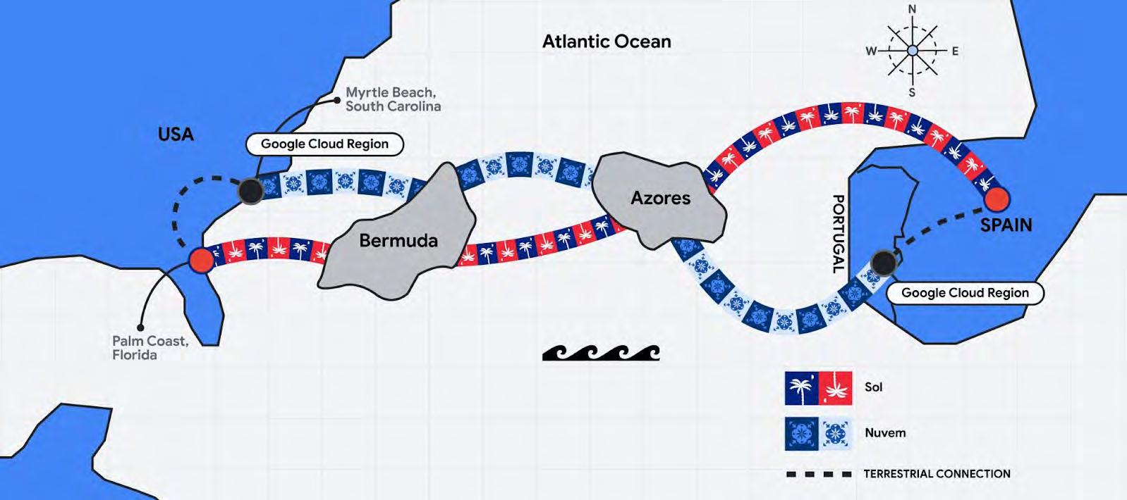 Google said Sol will complete its “unique investment in transatlantic resiliency — with the two systems interconnecting terrestrially in the U.S. and in Iberia, as well as in Bermuda and the Azores.”