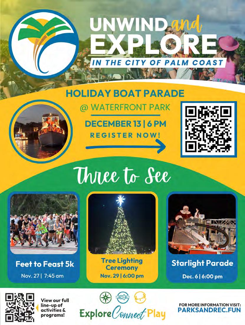There will be a special 20th anniversary celebration on Saturday, Dec. 20, at 6:30 p.m., honoring the legacy of this event and the community that made it thrive. The club will also host the Holiday Market on Dec. 20. Palm Coast will host the Starlight Parade on Saturday, Dec. 6, at 6 p.m. in Central Park. Festivities include photos with Santa starting at 4 p.m. and food trucks from 6 p.m. to 8:30 p.m.