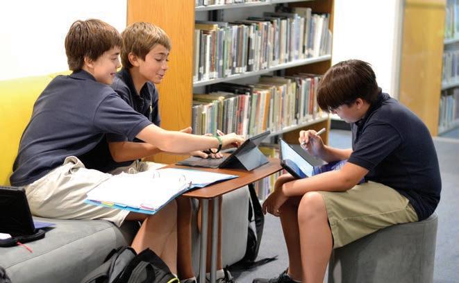 e Library building underwent renovations last year on the second floor to create a new reading room for students as well as a large meeting room for special classes and events. e renovations continued this summer on the first floor with a new, enlarged reading room downstairs to accommodate more books as well as more student study areas. e central floor area of the library was reimagined to create reconfigurable study areas and to encourage collaboration between our students and our faculty. New technology has been deployed throughout the library along with energy efficient LED light fixtures. Similar to the Middle School restrooms, the library restrooms were renovated to match the new function and aesthetic.