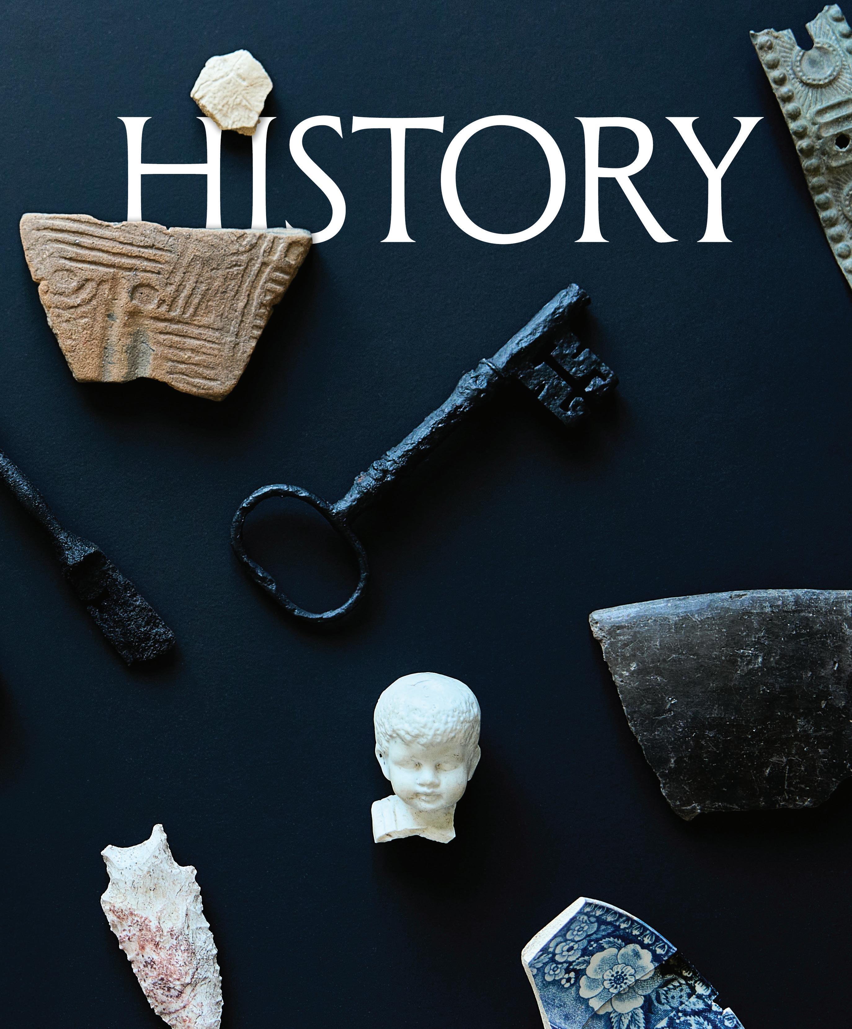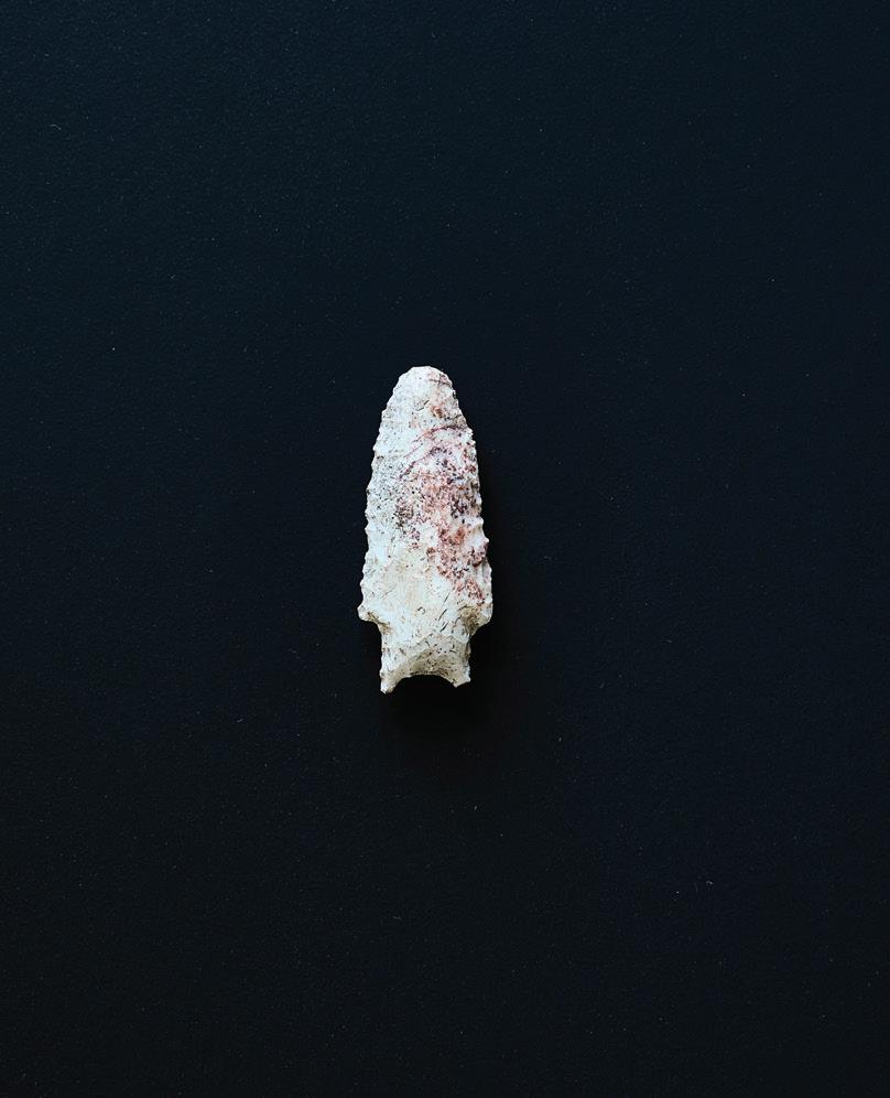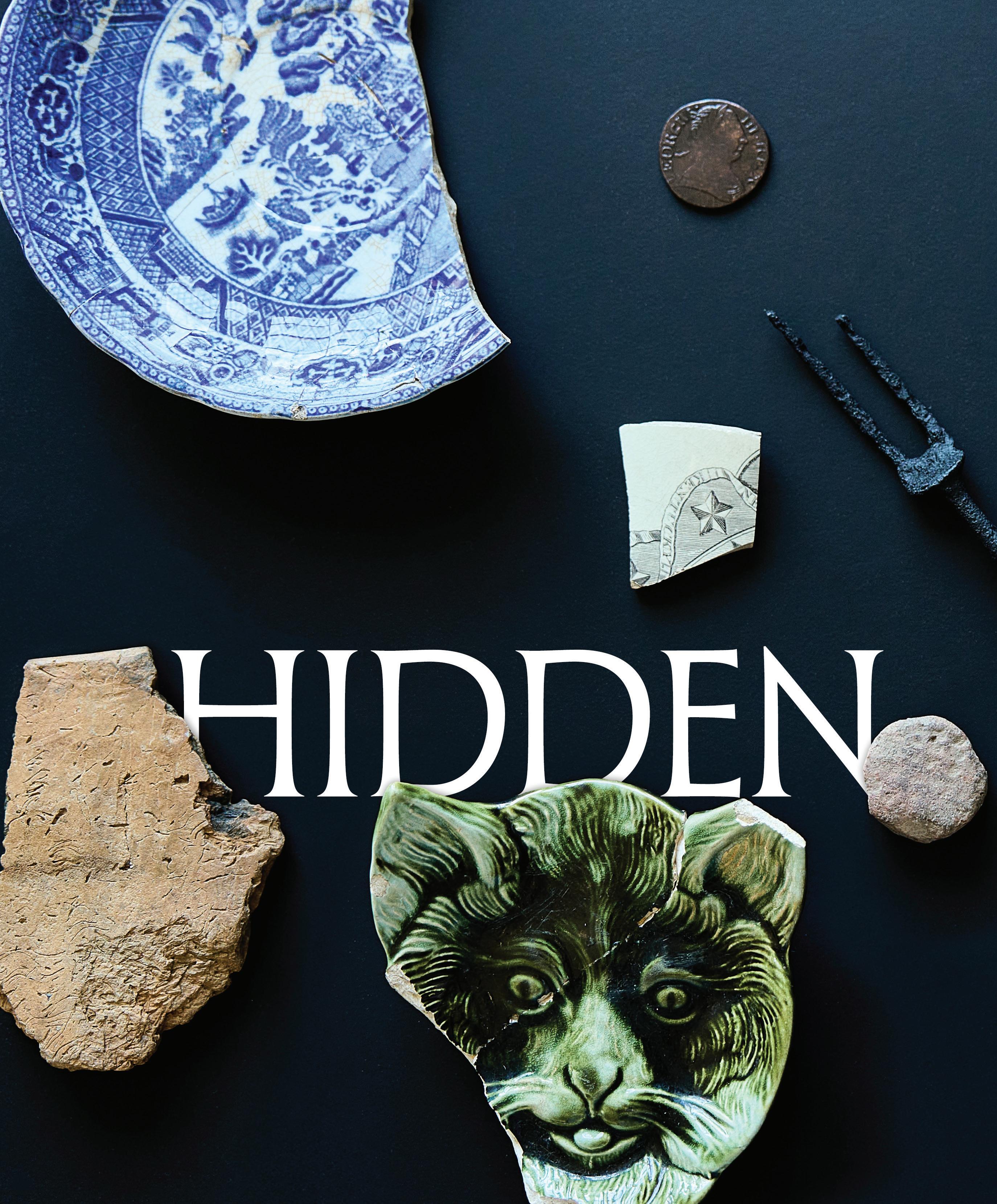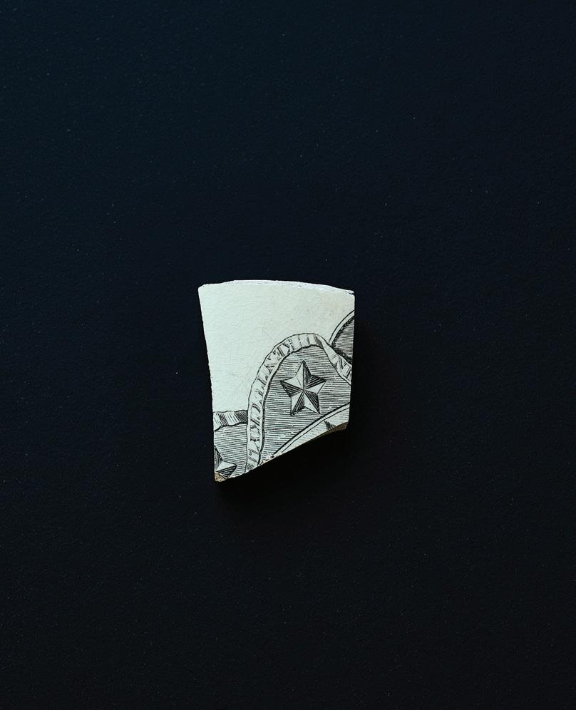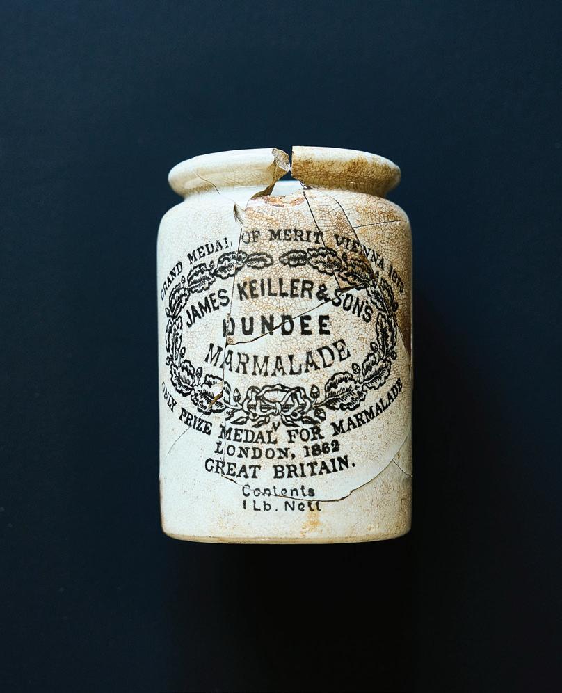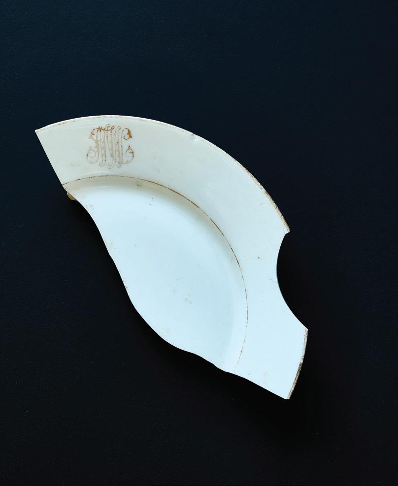 OPPOSITE PAGE, CLOCKWISE. A MARMALADE CROCK FOUND IN THE WILSON BOTTLE DUMP WAS GLUED BY ZOE KLAUCK. THIS MARMALADE IS STILL PRODUCED TODAY. || A FRAGMENT OF MARION MASON WILSON’S MONOGRAMMED DINNER PLATE || LATE ARCHAIC PROJECTILE POINT DATING TO APPROXIMATELY 4,000 YEARS AGO || A DECORATIVE METAL FURNITURE RIBBON FROM THE NINETEENTH OR EARLY TWENTIETH CENTURY || A BENT CIVIL WAR-ERA SOCKET BAYONET || CREAMWARE SHERD OF WASHINGTON #1 PATTERN PRODUCED BETWEEN 1792 AND 1796