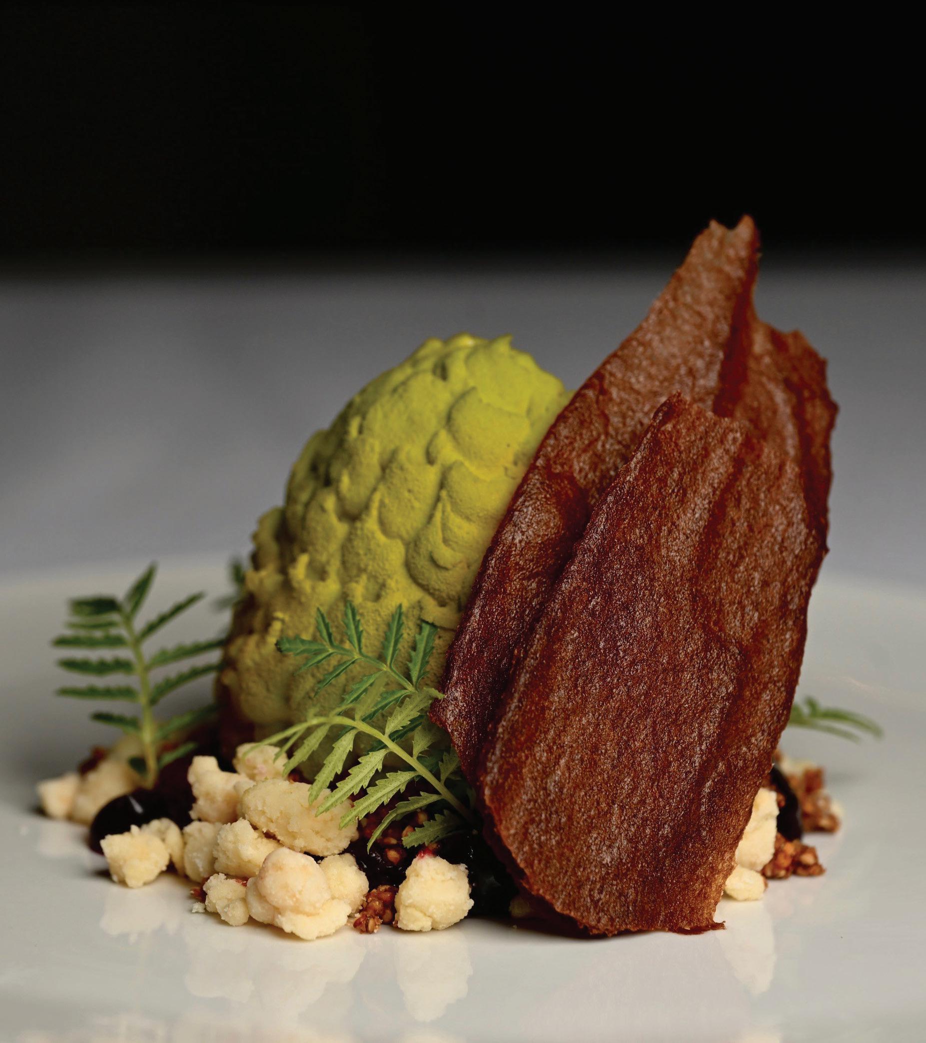 those delicate notes. The infusion was strained, set, and whipped into a silky crèmeux. From there, the dessert took shape—literally. Using a piping tip, Chef Melissa sculpted the crèmeux into the form of a pinecone. Then, using an airbrush technique, she layered on shades of yellow, green, and brown until it looked as though it had fallen straight onto the forest floor from the canopy above.