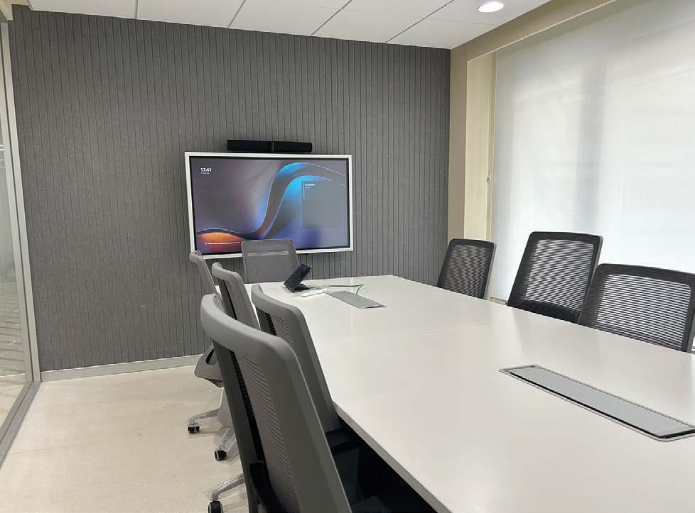 To optimize audio quality and maintain the aesthetic integrity of the space, pendant microphones were proposed in conjunction with ceiling speakers for seamless audio reinforcement. Given the V-shaped configuration of the table, the implementation of VC (video conferencing) cameras, paired with the expansive 85”