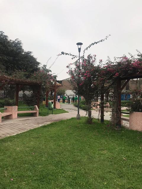Toda la plaza está rodeada de edificaciones de 2 a 4 pisos aproximadamente, la mayoria de estas, son tiendas, consultorios, restaurantes, gimnasios y minimarkets Por otro lado la plaza esta llena de árboles y césped que dan una vista agradable