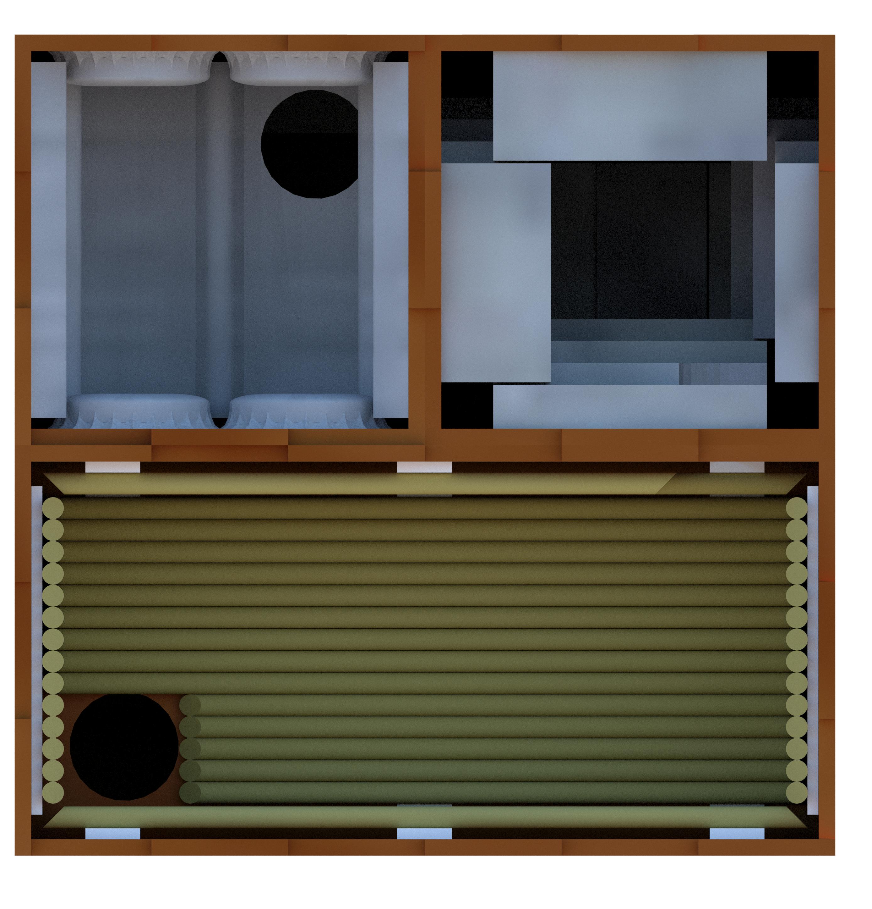 Composed of reusable PET bottle “fringes” (in order to reduce environmental impacts) on two of the larger sides and plastic plates on the other surfaces.
