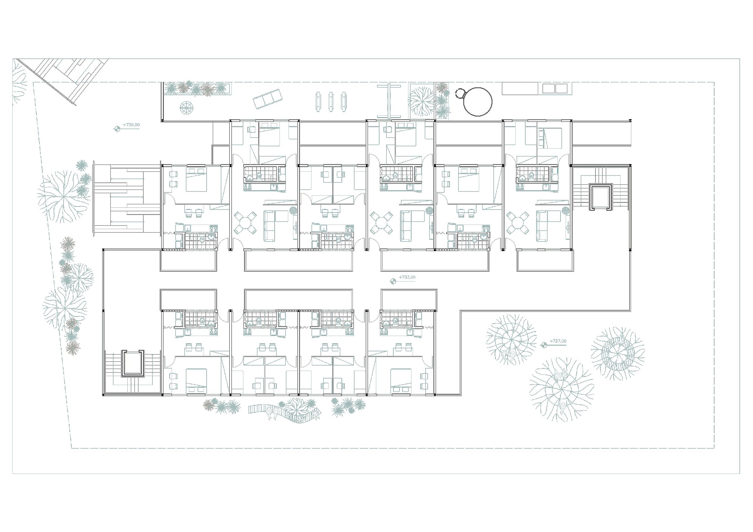 PLANT LEVEL 733 SECTION AA DENSITY allocate the numberinfrastructuresurroundingtoagoodofpeople 05 ACCESSIBILITY provide two modes of universal access to the upper floor: ramp and elevator 06 COMFORT position circulation towers so that all units have lighting and ventilation 04 VOLUMETRY impact of the volume with the surroundings with a maximum of 7 floors 02 VIEW value the view from the houses to the river park and make the community terrace 03 FLOWS distinguish flow from nursery care and social housing and integrate flows with neighboring projects 01