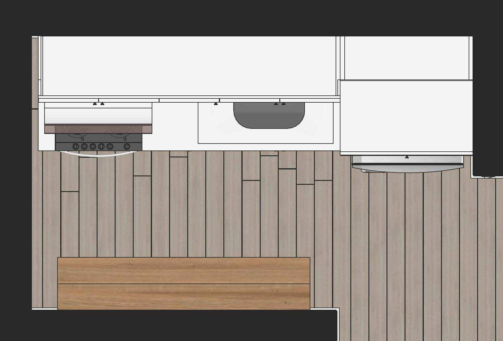 O projeto da cozinha do apartamento 32 faz parte do projeto de design de interiores desenvolvido para o apartamento de um jovem casal no centro de São Paulo. Tanto o design quanto a escolha de materiais e cores, foram escolhidos de acordo com o perfil do cliente e a lista de requisitos levantados. Devido à pequena área retangular da cozinha, foi proposta a criação de uma cozinha linear, concentrando as áreas de serviço em uma única parede. Do outro lado, há prateleiras e uma mesa dobrável embutida na parede para refeições rápidas. O
