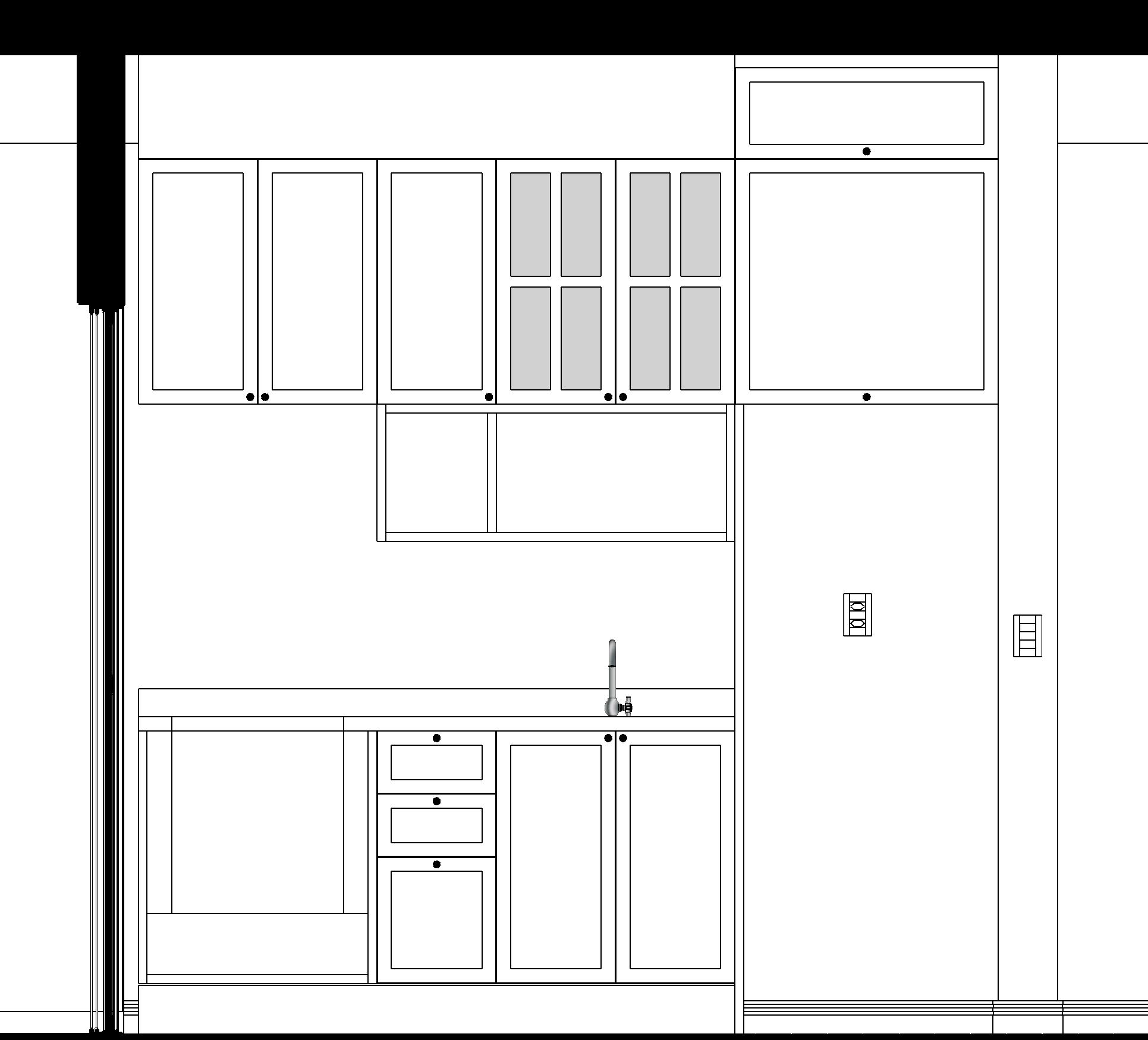uso da cor branca foi priorizado para proporcionar a sensação de ampliação. A luminária linear foi escolhida para garantir uma iluminação homogênea de toda a cozinha e também foram instaladas luzes acima da bancada da pia. Abaixo do armário da pia há uma longa gaveta para guardar vassouras e acessórios de limpeza. Acima da geladeira, há portas basculantes para que o morador de menor estatura possa acessá-la com facilidade. Como a rede de tubulação corre ao longo das bordas do teto, o armário se estende até o teto para cobri-lo.