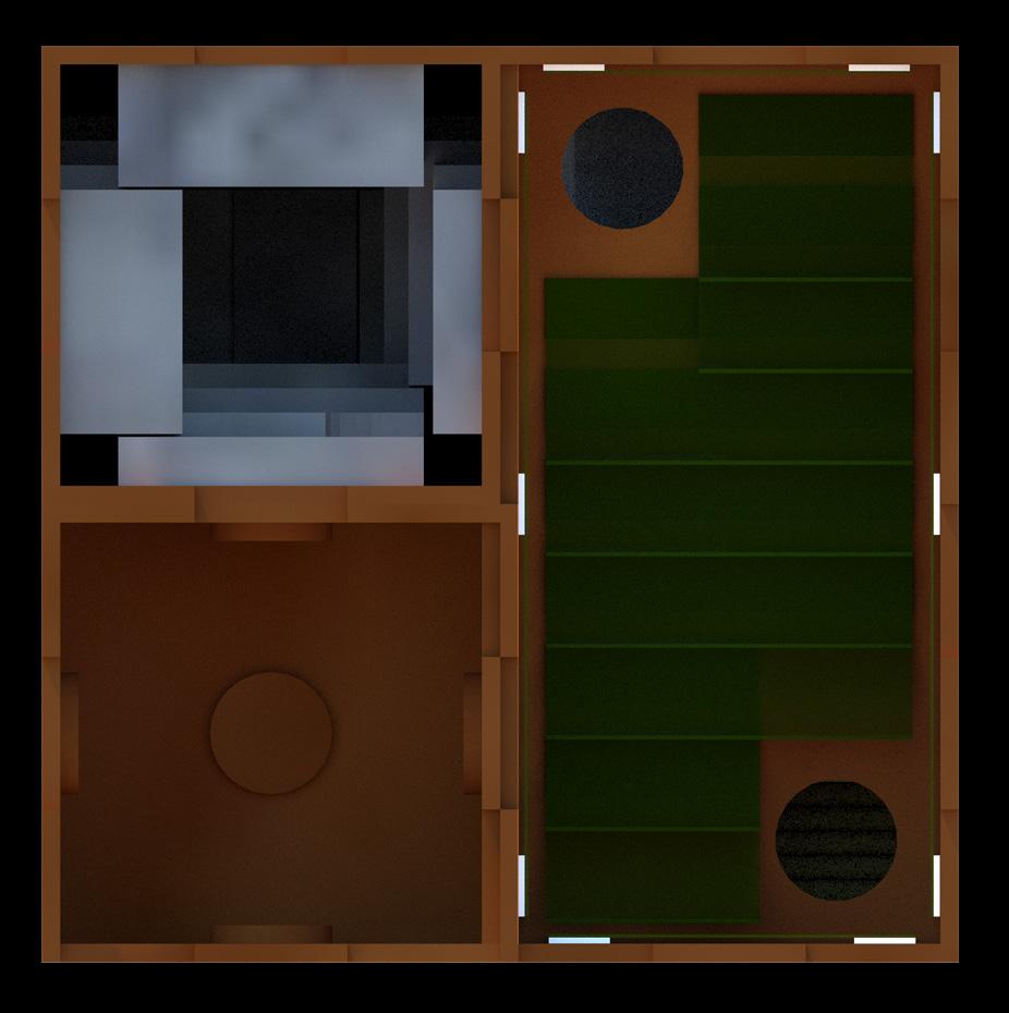 Composto por “franjas” de garrafa PET reaproveitável (no intuito de reduzir impactos ambientais) em duas das faces maiores e placas retangulares e quadradas nas demais superfícies.