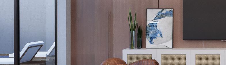 Com a intenção de trazer o contraste do urbanizado externo, o interior no Loft 23 foi todo trabalhado com mate riais que remetessem ao natural como a madeira presente em todos os ambientes, o couro que vem em destaque com o sofá da sala e a cor azul que também traz um conforto mais relevante e significativo para o espaço.