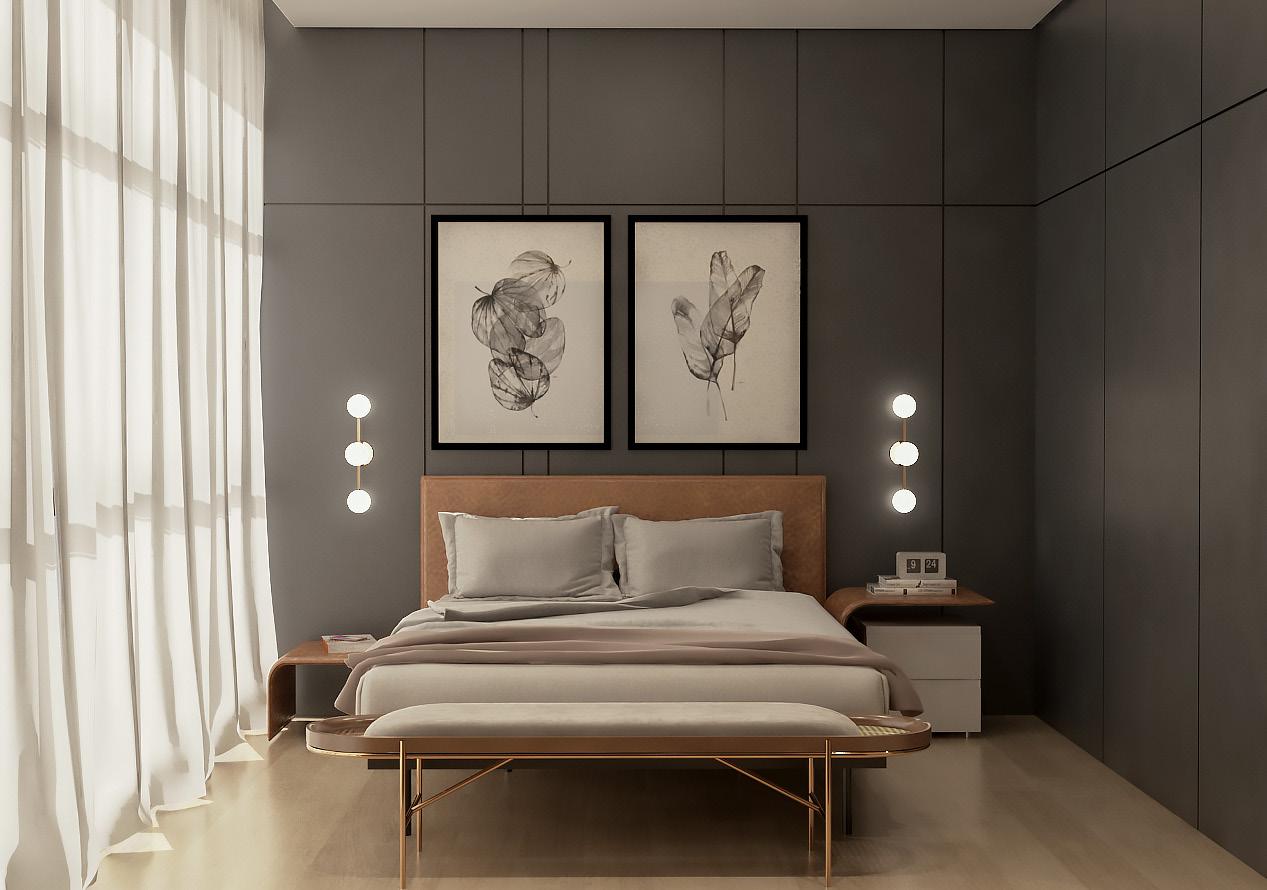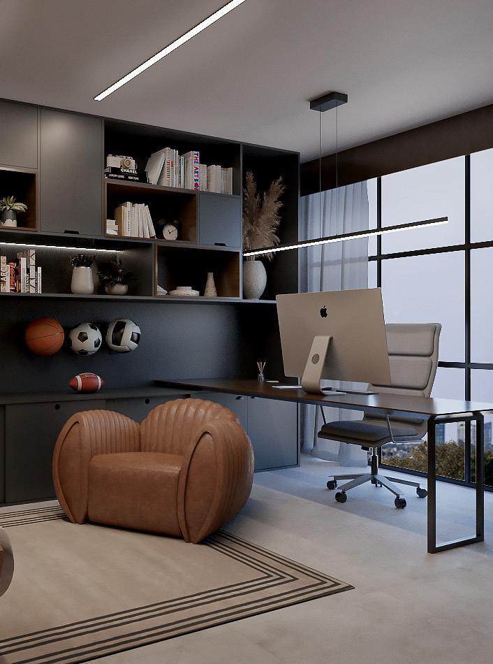Seguindo tem dois projetos de quartos infantis sendo eles, um para uma garota que queria uma cama no alto e que gostava muito de desenhos e maquiagem, por isso o desenvolvimento de uma grande bancada para estudos e penteadeira. O outro para um garoto viciado no Sonic e que que ria uma cabana no quarto. Continuando na temática de quartos, a próxima imagem é de uma suíte que a iluminação natural era o melhor ponto existente, para contrastar com essa luz intensa, foi criado um painel azul petróleo para destacar a cama de design em couro.