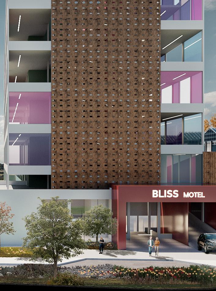 Brasil - 2020 Paloma Chartone O Bliss Motel foi desenvolvido em um terreno localizado próximo a vários pontos importantes da cidade de Juiz de Fora, trazendo assim o comércio para mais próximo da área urbanizada da cidade e englobando-o no cotidiano da popu lação.Partindo do conceito de trazer a experiencia do Motel para desde o momento em que avista o edifício, usou-se das cores e elementos mais chamativos, como o aço cortem e o vermelho vivo. Com o intuito de trazer a população para des frutar do espaço, foi implementado um Hotel e uma área para realização de eventos.