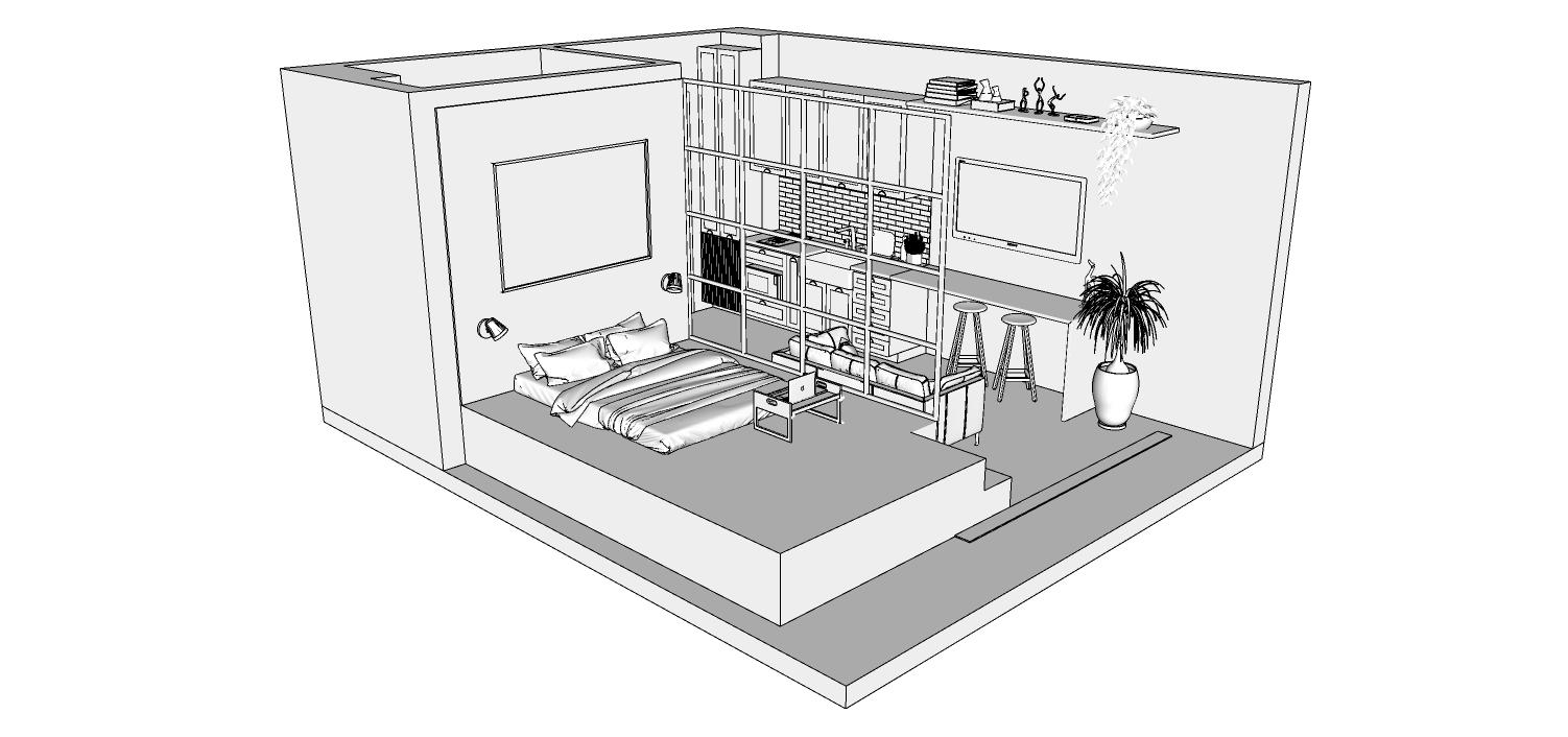 O foco, desde o início, era manter o conceito de Loft, porém com os espaços mais delimitados e com a maior preservação da privacidade para o quarto. Para que isso se mantivesse, foi proposto a elevação da área íntima e a colocação de uma divisória de metalom com vidros canelados.