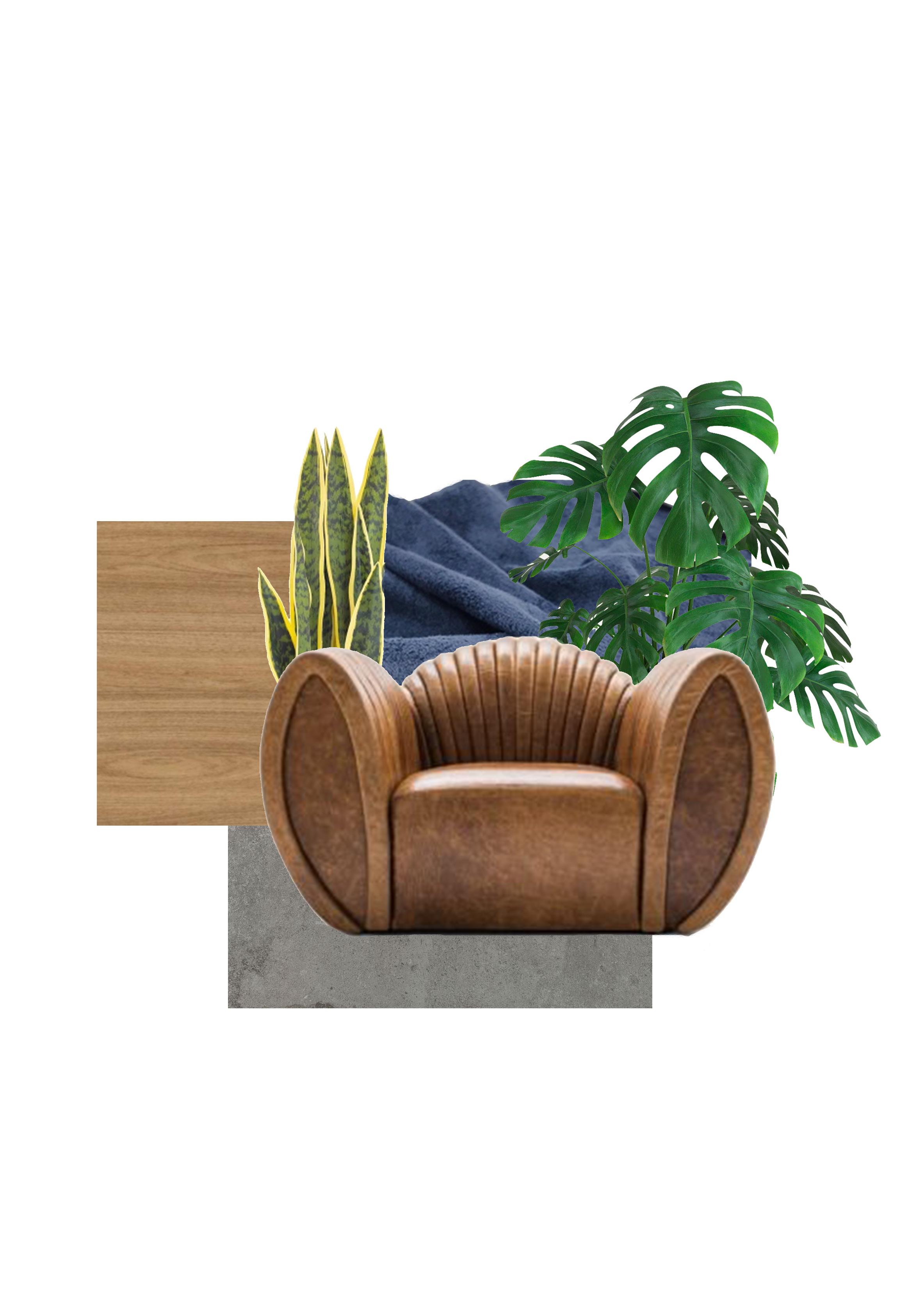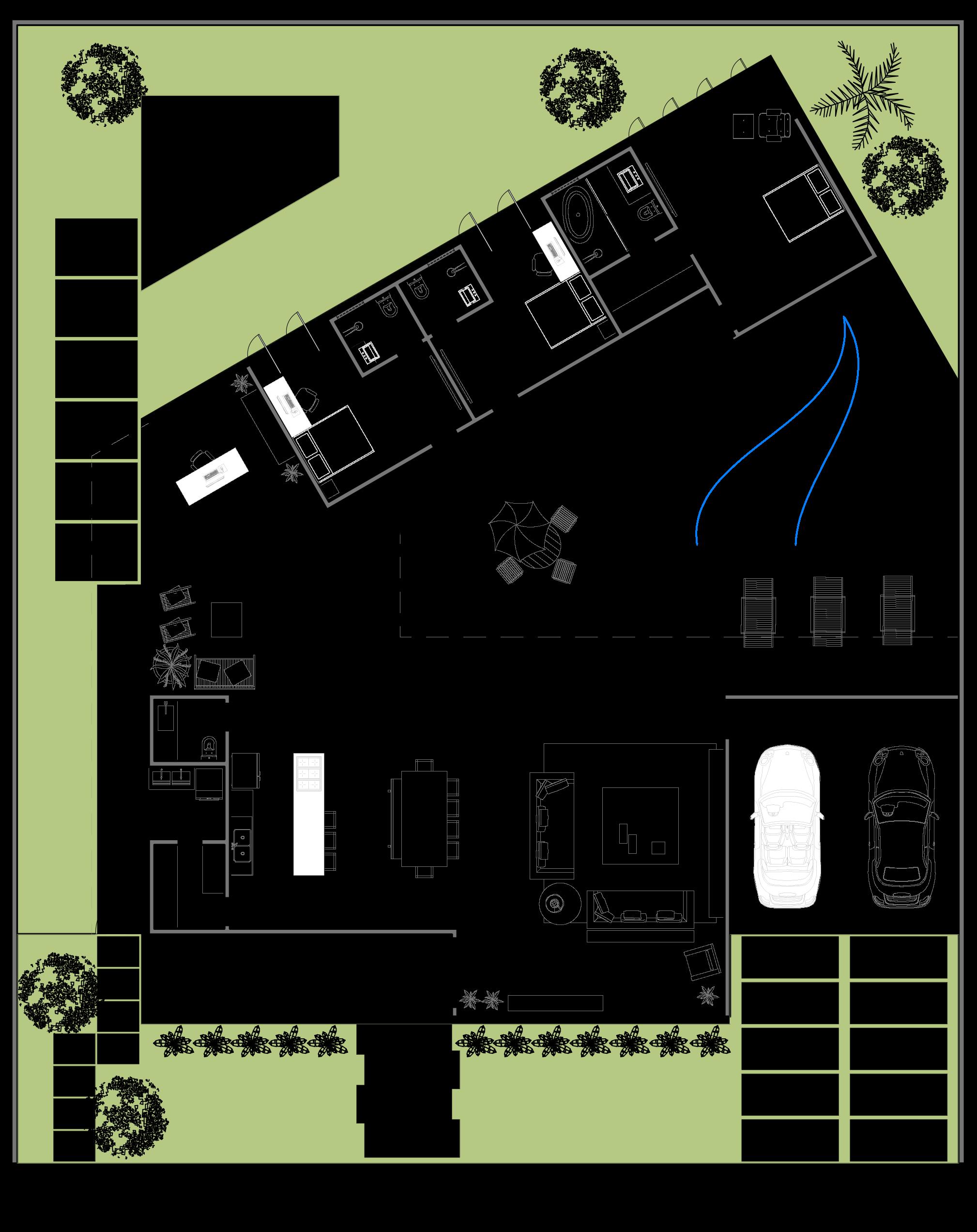 do uma maior sofisticação, porém mantendo ainda a ideia dos materiais simples e naturais. Muita madeira, couro e tons como azul e verde que trazem sensações intimistas e relacion am-se com a natureza. Tudo junto a layouts que favorencem o bom funcionamento de todo o espaço e o bom gosto. Seu programa de necessidades consiste em uma grande sala de pé direito alto integrada com a cozinha e interligada a área de lazer, para que o espaço social da casa se concentrassem na frente de toda a residencia, afastando, as sim, as três suítes e um home office de concei ro aberto.