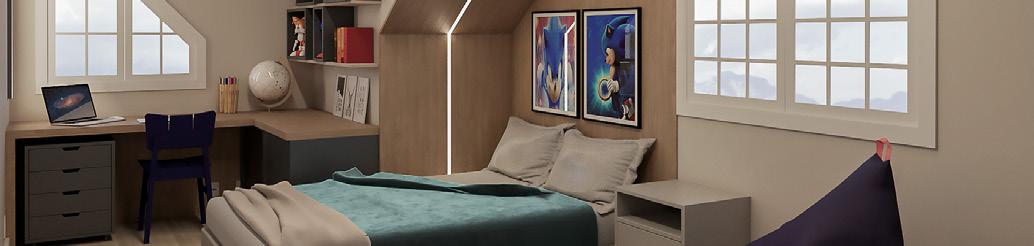 Seguindo tem dois projetos de quartos infantis sendo eles, um para uma garota que queria uma cama no alto e que gostava muito de desenhos e maquiagem, por isso o desenvolvimento de uma grande bancada para estudos e penteadeira. O outro para um garoto viciado no Sonic e que que ria uma cabana no quarto. Continuando na temática de quartos, a próxima imagem é de uma suíte que a iluminação natural era o melhor ponto existente, para contrastar com essa luz intensa, foi criado um painel azul petróleo para destacar a cama de design em couro.